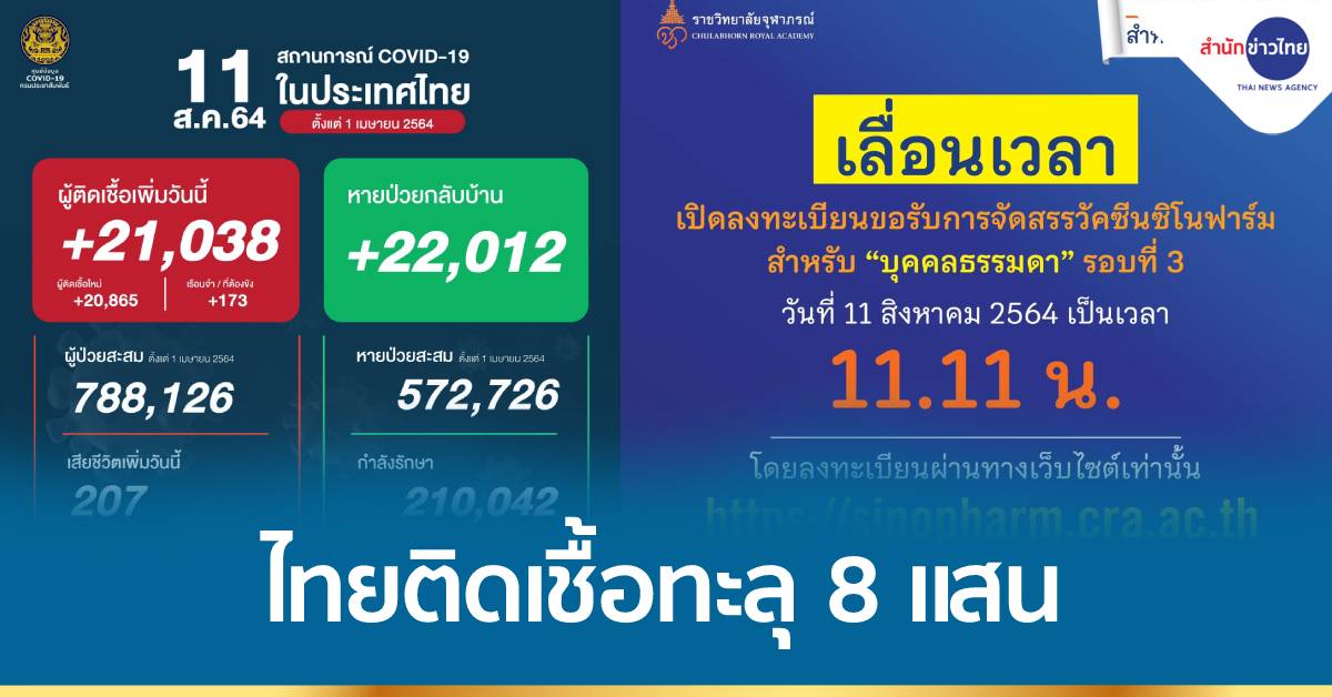 กทม. 11 ส.ค.-ไทยติดเชื้อโควิด สะสม 816,989 คน ป่วยใหม่วันนี้ 21,038 คน เสียชีวิต 207 ราย ราชวิทยาลัยจุฬาภรณ์ เลื่อนลงทะเบียนวัคซีน “ซิโนฟาร์ม” สำหรับบุคคลธรรมดา เป็นเวลา 11.11 น.