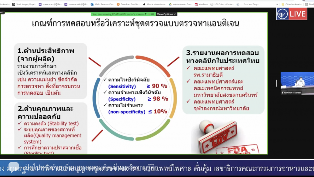 สำนักข่าวไทย 13 ส.ค.- อย. แจงหลักเกณฑ์มาตรฐานชุดตรวจ ATK ก่อนรับรอง ตรวจทั้งแล็บและเอกสาร ให้ผู้เชี่ยวชาญวิเคราะห์ก่อน มีมาตรฐานเท่าสากล ชี้ปม ATK ของจีน ที่ไม่ได้ขึ้นทะเบียน FDA USA เพราะไม่ได้วางขายที่สหรัฐ ส่วน อภ.เผยไม่อาจล็อกสเปกทางอ้อมตามคำสั่ง สปสช.ได้ เพราะเป็นการเปิดซองประมูล สินค้ามีคุณภาพ มีหลักฐานพร้อมชี้แจง