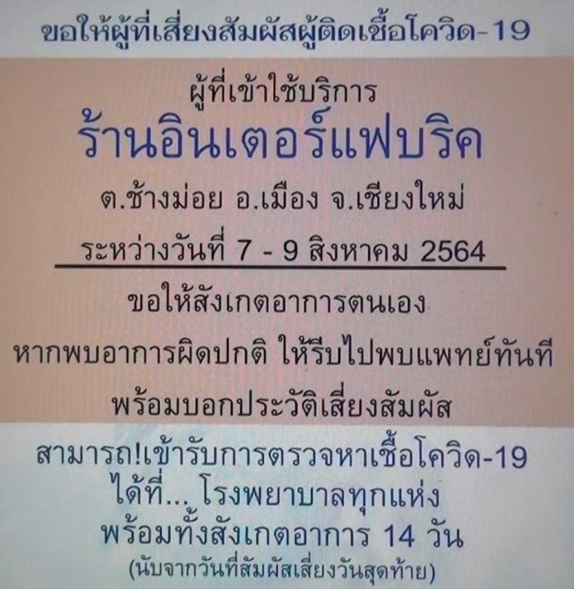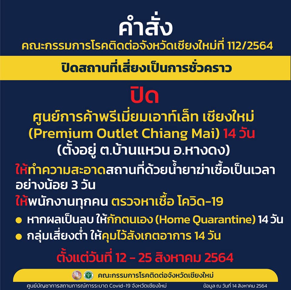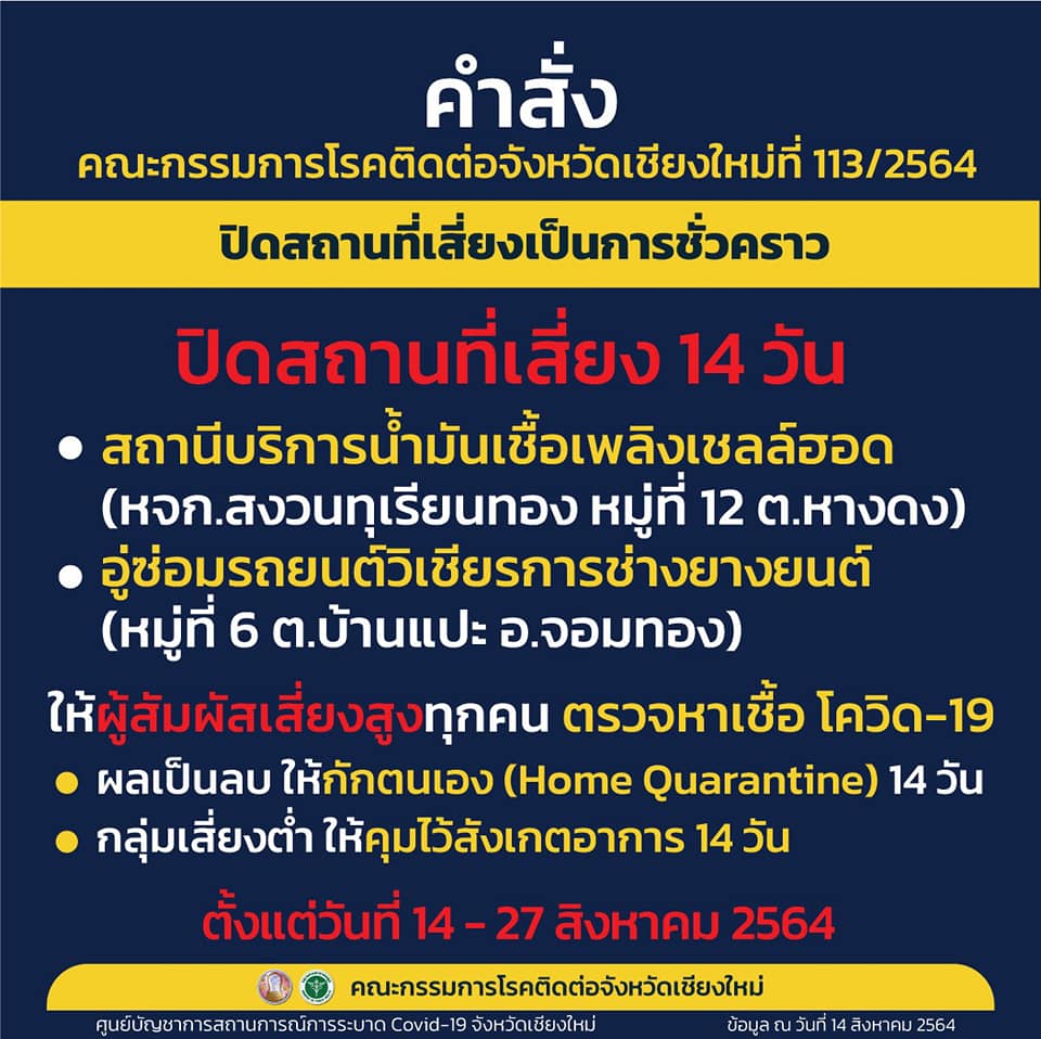 นอกจากนี้ ยังสั่งปิดสถานบริการในพื้นที่ อ.หางดง 2 แห่ง ได้แก่ ศูนย์การค้าพรีเมี่ยมเอาท์เล็ท และปิดสถานีบริการน้ำมันเชื้อเพลิงเชลล์ฮอด (หจก.สงวนทุเรียนทอง) รวมทั้งอู่ซ่อมรถยนต์วิเชียรการช่างยางยนต์ อ.จอมทอง เป็นเวลา 14 วัน เนื่องจากเชื่อมโยงคลัสเตอร์ใน อ.หางดง ที่มีผู้ป่วยมากถึง 83 ราย. – สำนักข่าวไทย