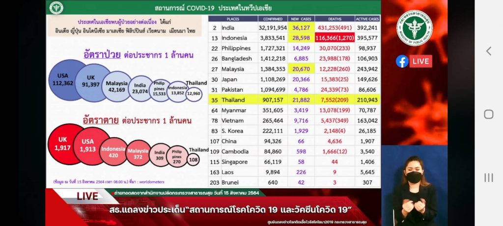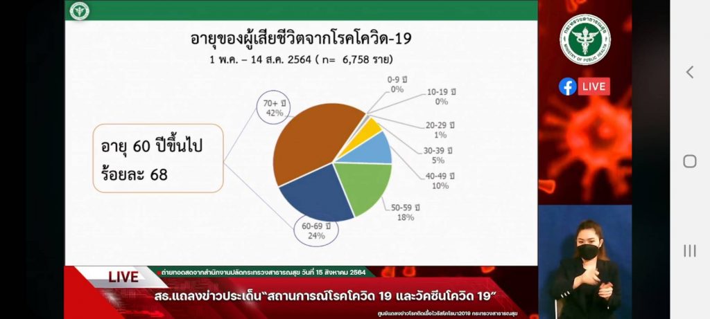 นพ.เฉวตสรร นามวาท ผู้อำนวยการกองควบคุมโรคและภัยสุขภาพในภาวะฉุกเฉิน กรมควบคุมโรค แถลงสถานการณ์โรคโควิด-19 และวัคซีน ตัวเลขการติดเชื้อวันนี้ (15 ส.ค.) ผู้ติดเชื้อใหม่ 21,882 ราย เสียชีวิต 209 ราย โดยมีผู้ป่วยปอดอักเสบ 5,615 ราย ใส่เครื่องช่วย 1,172 ราย การเสียชีวิตยังอยู่ที่ร้อยละ 0.85 น้อยกว่าค่าเฉลี่ยของโลกที่อยู่ที่ร้อยละ 1 สำหรับค่ากลางอายุผู้เสียชีวิตยังอยู่ที่ 68 ปี บ่งชี้ว่า ผู้เสียชีวิตจากโรคโควิด ร้อยละ 90 เป็นผู้สูงอายุและผู้ที่มีโรคเรื้อรัง เมื่อป่วยจะมีอาการรุนแรง และนำไปสู่การเสียชีวิต ทั้งผู้สูงอายุและผู้มีโรคเสี่ยง จึงเป็นกลุ่มเป้าหมายที่ต้องเน้นให้รับวัคซีน เพื่อป้องกันความรุนแรง ทั้งนี้ภาพรวมการติดเชื้อทั่วโลก แสดงให้เห็นว่า แม้ประเทศที่ได้รับวัคซีนมากแล้ว ก็ยังมีผู้ติดเชื้อรายใหม่จำนวนมาก เช่น สหรัฐ อินเดีย อังกฤษ แต่ตัวเลขการเสียชีวิตลดลง ซึ่งแสดงถึงประสิทธิภาพของวัคซีน
