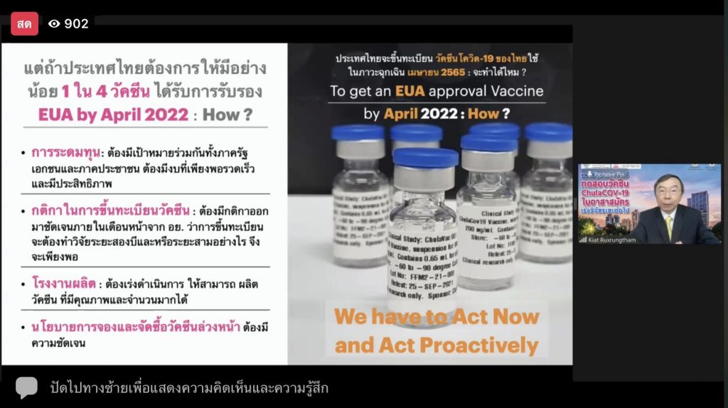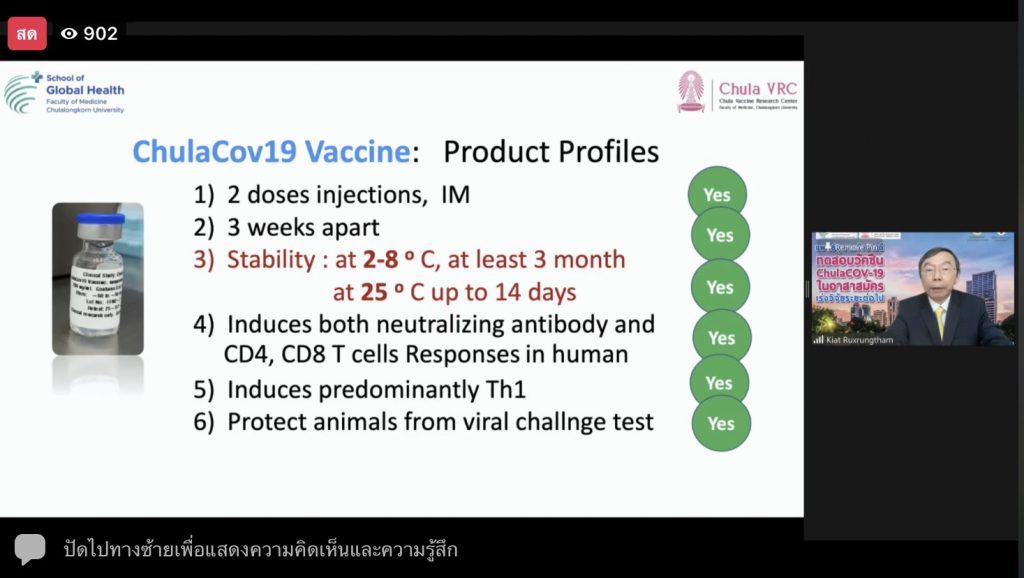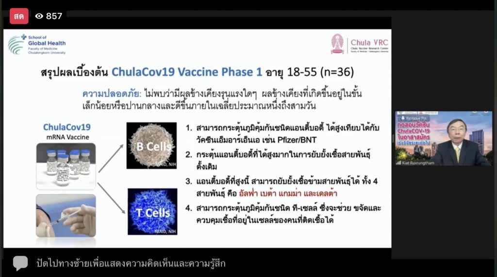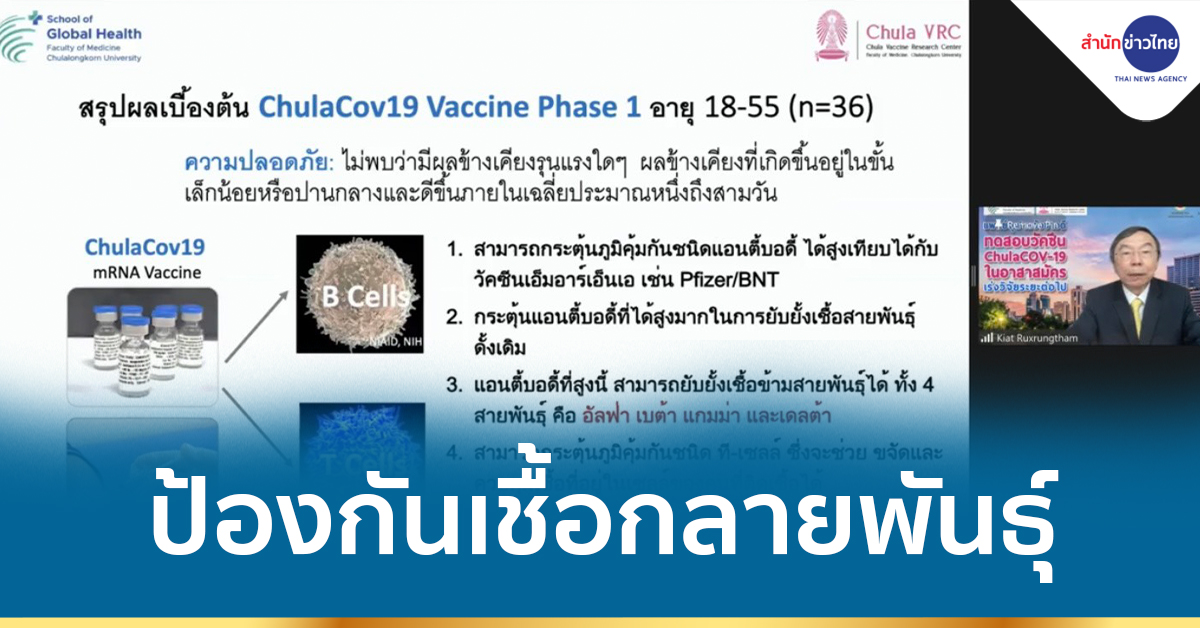 แพทย์จุฬาฯ เผยผลทดสอบวัคซีน ChulaCov19 ในอาสาสมัครกระตุ้นภูมิคุ้มกันได้สูงเทียบเท่ากับวัคซีน mRNA ไฟเซอร์ ไบออนเทค ยับยั้งเชื้อสายพันธุ์ดั้งเดิม และเชื้อกลายพันธุ์ ทั้ง 4 สายพันธุ์ คือ อัลฟา เบตา แกมมา และเดลตา ช่วยขจัดและควบคุมเชื้อที่อยู่ในเซลล์ของผู้ติดเชื้อโควิดได้เป็นอย่างดี