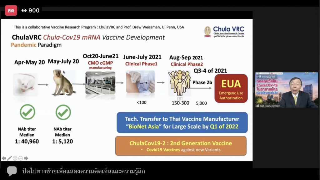 รพ.จุฬาลงกรณ์ สภากาชาดไทย และศูนย์วิจัยวัคซีน คณะแพทยศาสตร์ จุฬาฯ แถลงความคืบหน้าล่าสุดการวิจัยและพัฒนา ChulaCov19 วัคซีน mRNA สัญชาติไทยรุ่นเแรก ที่ทำร่วมกับมหาวิทยาลัยเพนซิลเวเนีย โดยวัคซีน ChulaCov19 ผลิตสร้างขึ้นจากชิ้นส่วนขนาดจิ๋วของสารพันธุกรรมของเชื้อไวรัสโคโรนา (โดยไม่มีการใช้ตัวเชื้อแต่อย่างใด) ซึ่งเมื่อร่างกายได้รับชิ้นส่วนของสารพันธุกรรมขนาดจิ๋วนี้เข้าไป จะทำการสร้างเป็นโปรตีนที่เป็นส่วนปุ่มหนามของไวรัสขึ้น (spike protein) และกระตุ้นให้เกิดการสร้างภูมิคุ้มกันไว้เตรียมต่อสู้กับไวรัสเมื่อไปสัมผัสเชื้อ เมื่อวัคซีน mRNA ทำหน้าที่ให้ร่างกายสร้างโปรตีนเรียบร้อยแล้ว ภายในไม่กี่วัน mRNA นี้จะถูกสลายไปโดยไม่มีการสะสมในร่างกายแต่อย่างใด ภายหลังประสบความสำเร็จจากการทดลองในลิงและหนู พบว่าช่วยยับยั้งไม่ให้เชื้อไวรัสเข้าสู่กระแสเลือดและสามารถสร้างภูมิคุ้มกันได้ในระดับสูง จึงได้ผลิตและทดสอบทางคลินิกระยะที่ 1 ให้กับอาสาสมัครคนไทย ไปเมื่อวันที่ 24 มิถุนายน 2564 เพื่อหาปริมาณวัคซีน ChulaCov 19 ที่มีประสิทธิภาพสูงสุด