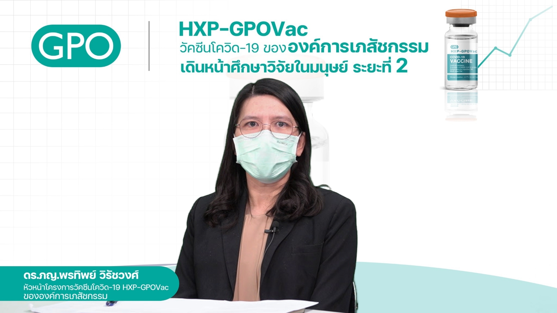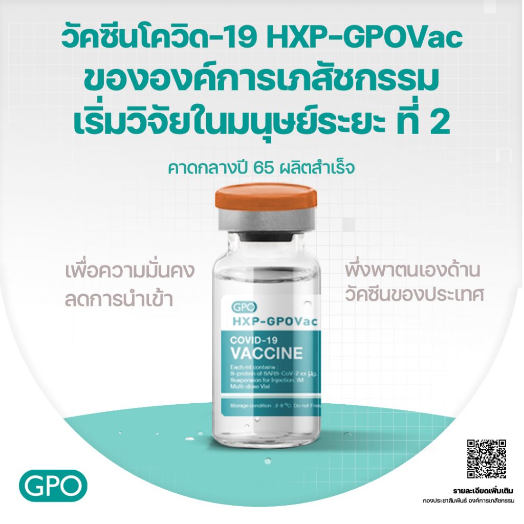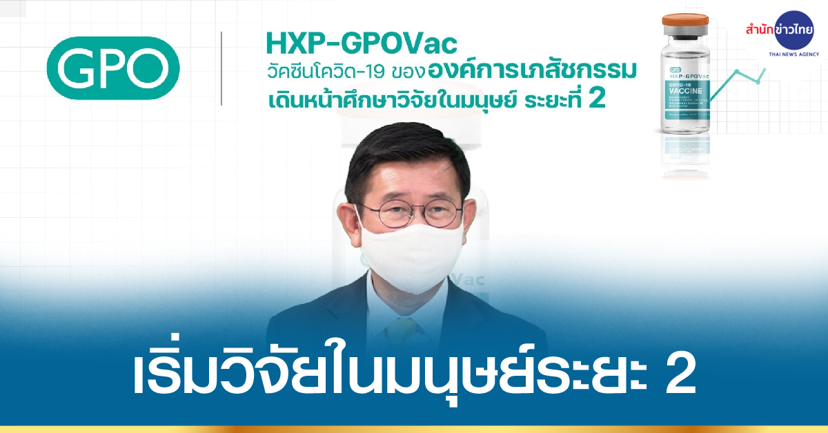 นพ.วิฑูรย์ ด่านวิบูลย์ ผู้อำนวยการองค์การเภสัชกรรม กล่าวว่า องค์การเภสัชกรรมได้ดำเนินการวิจัยพัฒนากระบวนการผลิตวัคซีน และได้ทำการผลิตวัคซีนป้องกันโควิด-19 HXP-GPOVac จนสำเร็จในขั้นแรก และกำลังเข้าสู่ขั้นตอนของการศึกษาวิจัยในมนุษย์ ซึ่งขณะนี้การศึกษาวิจัยในมนุษย์ ระยะที่ 1 ได้ผลการวิเคราะห์ภูมิคุ้มกันที่ 14 วัน หลังจากได้รับวัคซีนครบ 2 เข็มแล้ว โดยในวันนี้ (16 สิงหาคม 2564) องค์การฯ ได้เริ่มทำการศึกษาวิจัยในมนุษย์ ระยะที่ 2 โดยวิจัยในอาสาสมัคร จำนวน 250 คน อายุ 18-75 ปี ที่มีสุขภาพดี ไม่เคยฉีดวัคซีนป้องกันโควิดทุกชนิดมาก่อน และไม่เคยเป็นผู้ป่วยโควิดมาก่อน