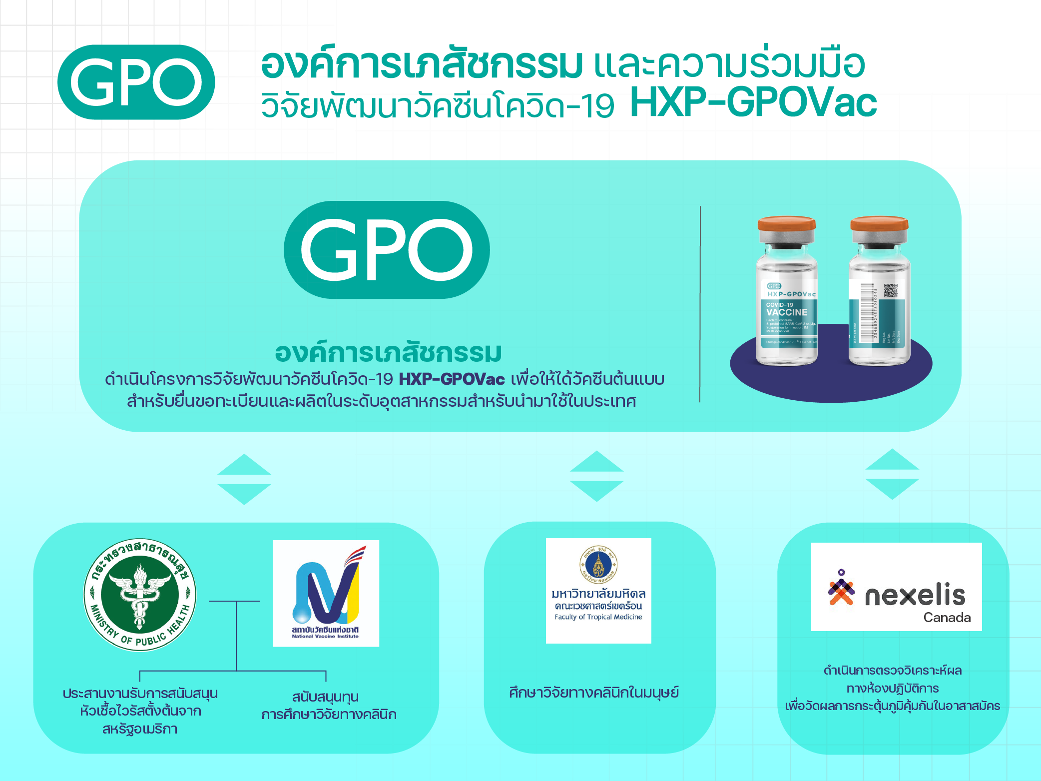 การพัฒนาวัคซีน HXP-GPOVac ได้รับการสนับสนุนจากองค์กร PATH ที่ได้ส่งมอบหัวเชื้อวัคซีนต้นแบบ ซึ่งพัฒนาโดยโรงเรียนแพทย์ที่เมาท์ไซนาย (The Icahn School of Medicine at Mount Sinai) และมหาวิทยาลัยเท็กซัส ที่ออสติน (University of Texas at Austin) ประเทศสหรัฐอเมริกา มาทำการผลิตที่โรงงานผลิต (วัคซีน) ชีววัตถุ ขององค์การฯ ที่ ต.ทับกวาง อ.แก่งคอย จ.สระบุรี ซึ่งได้มีการวิจัยพัฒนากระบวนการผลิต และสามารถผลิตวัคซีน HXP-GPOVac จากนวัตกรรมเชื้อตายชนิดลูกผสม (Inactivated chimeric vaccine) ผลิตด้วยเทคโนโลยีไข่ไก่ฟัก (Egg-based) เช่นเดียวกับการผลิตวัคซีนไข้หวัดใหญ่ และนำเข้าสู่กระบวนการวิจัยในมนุษย์ได้สำเร็จในระยะเวลา 10 เดือน และเมื่อการศึกษาวิจัยในมนุษย์ครบทั้ง 3 ระยะ และได้รับการขึ้นทะเบียนตำรับ เพื่อใช้ในกรณีฉุกเฉิน (Emergency Use Authorization, EUA) จากสำนักงานคณะกรรมการอาหารและยา (อย.) สำเร็จ คาดว่าจะเริ่มผลิตได้ในกลางปี 2565 โดยจะสามารถผลิตได้ 20-30 ล้านโดส/ปี และจะทำการขยายกำลังการผลิตอย่างต่อเนื่อง ในเบื้องต้นนี้ “วัคซีน HXP-GPOVac” จะสามารถรองรับการฉีดเพื่อป้องกันโควิด-19 ให้ชาวไทยได้ 10-15 ล้านคน
