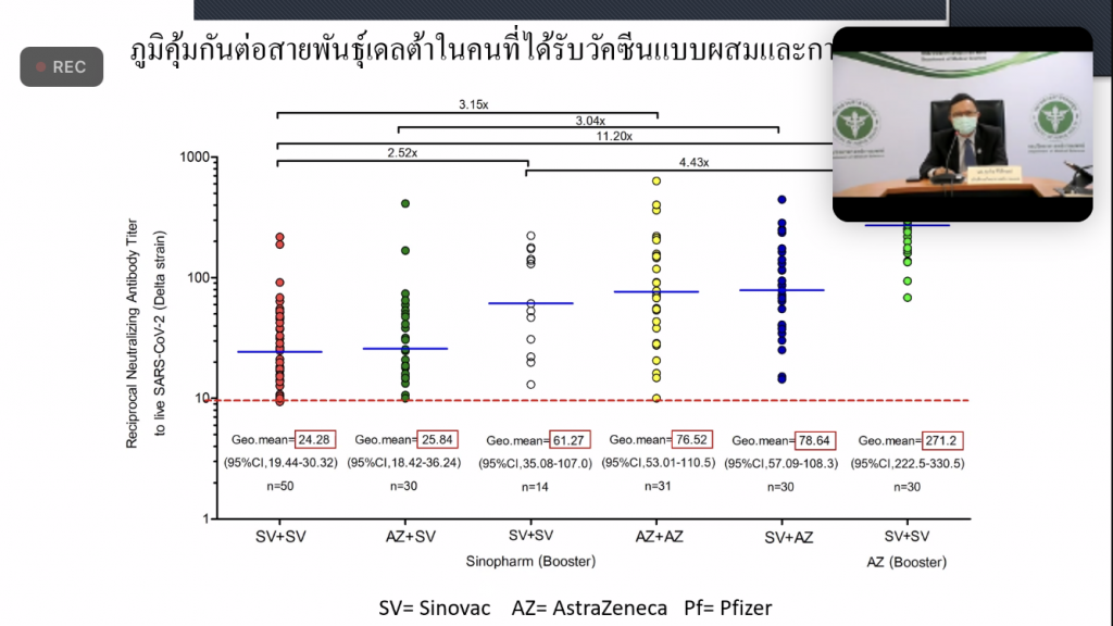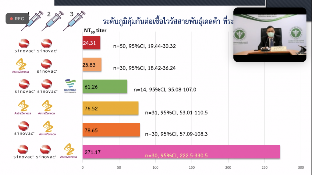 นพ.ศุภกิจ กล่าวว่า นอกจากนี้ มีการศึกษาแบบเฉพาะเจาะจงในเชื้อไวรัสที่กลายพันธุ์ สายพันธุ์เดลตา ทางกรมวิทย์ฯ ได้ทดลองในห้องปฏิบัติการชีวนิรภัย ระดับ 3 ที่มีความปลอดภัยสูงเนื่องจากนำซีรัม (เลือด) ของอาสาสมัคร ที่รับวัคซีนกับไวรัสเดลตาจริงมาทดลองในหลอดทดลอง ลักษณะของการเจือจาง 10-1000 เท่า และย้อมสีไวรัส เพื่อดูประสิทธิภาพของการยับยั้งเชื้อไวรัส โดยยิ่งเจือจางซีรัมมากเท่าไหร่ และเหลือจำนวนไวรัสลดลงครึ่งหนึ่ง ถือว่าวัคซีนมีประสิทธิภาพ โดยพบว่าสูตรวัคซีนซิโนแวค 2 เข็ม มีค่าเฉลี่ยมีการเจือจางอยู่ที่ 24.28 เท่า, แอสตราเซเนกา+ซิโนแวค อยู่ที่ 25.84 เท่า, แอสตราเซเนกา 2 เข็ม 76.52 เท่า, ซิโนแวค เข็ม 1 และแอสตราเซเนกา เข็ม 2 อยู่ที่ 78.64 เท่า จะเห็นว่ามีประสิทธิภาพใกล้เคียงกับการรับวัคซีนแอสตราเซเนกา 2 เข็ม ส่วนการการบูสเตอร์โดส ซิโนแวค 2 เข็ม และฉีดแอสตราฯ เป็นเข็ม 3 อยู่ที่ 271.2 เท่า ทั้งนี้จะเห็นว่า วัคซีนสูตรสลับไขว้ชนิดที่เป็นสูตรมาตราไทย การฉีดของไทยในขณะนี้ให้ผลดี มีประสิทธิภาพมากกว่า และใกล้เคียงการรับแอสตราฯ 2 เข็ม แต่ข้อดีคือการฉีดวัคซีนสูตรสลับชนิดนี้ ทำให้ลดระยะเวลาการรับวัคซีนให้สั้นลงได้ภูมิคุ้มกันเร็วขึ้น เพียง 5 สัปดาห์ โดยวัคซีนซิโนแวค เข็ม 1 จากนั้นห่าง 3 สัปดาห์ รับแอสตราฯ เป็นเข็ม 2 จากนั้นห่างอีก 2 สัปดาห์ ภูมิคุ้มกันก็ขึ้นได้ทันที เพราะขณะนี้การระบาดของไทย 95% ในกทม. เป็นไวรัสเดลตา ส่วนในต่างจังหวัด 90% ก็เป็นเดลตา และไม่แนะนำให้รับวัคซีนแอสตราฯ เป็นเข็ม 1 และซิโนแวค เป็นเข็ม 2 เพราะภูมิเท่าซิโนแวค 2 เข็ม