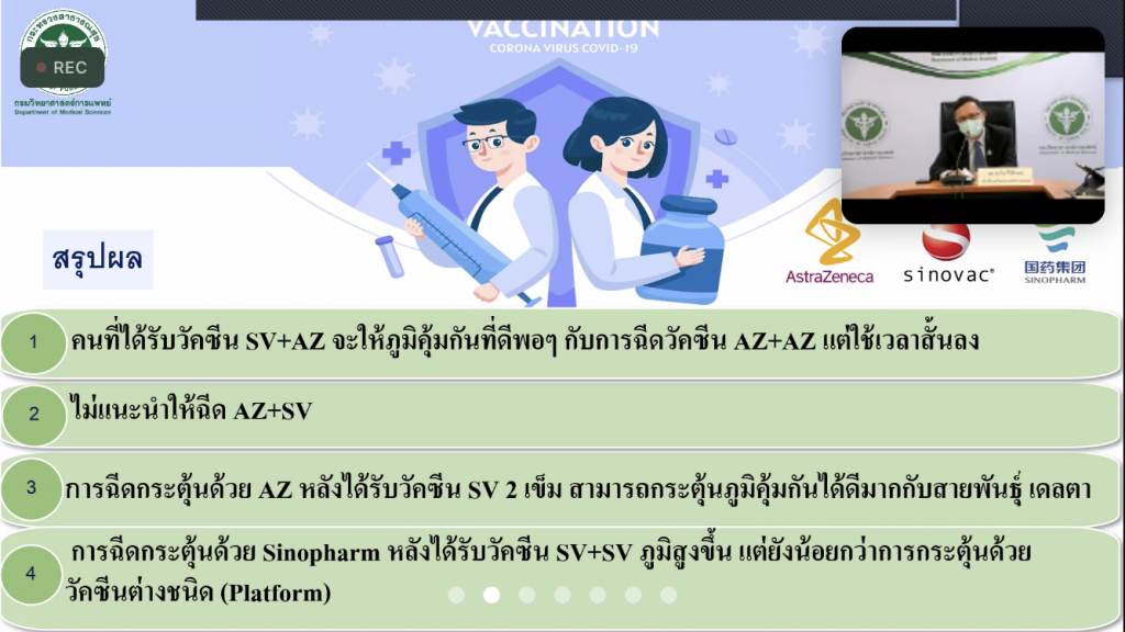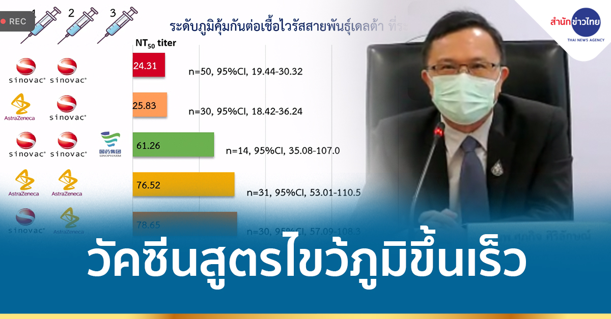 สำนักข่าวไทย 19 ส.ค.- กรมวิทย์แจงผลศึกษาทดลองประสิทธิภาพสูตรฉีดวัคซีนกับสายพันธุ์เดลตา ในห้องปฏิบัติการระดับ 3 พบวัคซีนไขว้สลับชนิดให้ผลดีสุด และภูมิขึ้นเร็ว เพียง 5 สัปดาห์ รองลงมาแอสตราฯ 2 เข็ม ส่วนการฉีดแบบบูสเตอร์ แอสตราฯ เป็นเข็ม 3 หลังรับซิโนแวค พบให้ผลดีเช่นกัน แต่ไม่สนับสนุนฉีดแอสตราฯ เข็ม 1 และซิโนแวค เข็ม 2