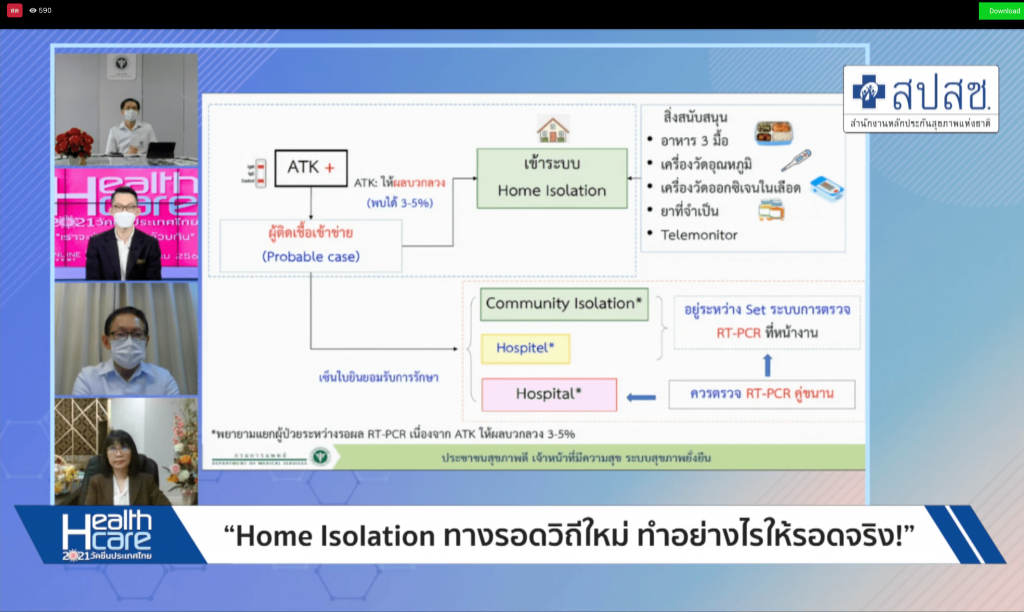 นพ.สมศักดิ์ กล่าวด้วยว่า โดยหลักการเมื่อตรวจ ATK แล้วผลเป็นบวก กระบวนการต่อไปคือการเข้าสู่ระบบการดูแลแบบ Home Isolation, Community Isolation โดยทางสำนักงานหลักประกันสุขภาพแห่งชาติ (สปสช.) จะสนับสนุนอาหาร 3 มื้อ เครื่องวัดอุณหภูมิ เครื่องวัดออกซิเจนในเลือด ยา และมีแพทย์ติดตามอาการผ่านระบบการดูแลผู้ป่วยทางไกล ซึ่งปัจจุบันมีคนไข้ที่เข้าระบบการดูแลแบบ Home Isolation, Community Isolation แล้วประมาณ 7-8 หมื่นคน และพบว่าจำนวนผู้ติดเชื้อรอเตียงที่เคยสูงถึงหลักหมื่น ปัจจุบันลดจำนวนลงเรื่อยๆ หรือตัวเลขระยะเวลาการรอเตียงของผู้ป่วยสีเหลือง-แดง ที่มากกว่า 1 วัน ก็ลดลงกว่า 50% ข้อมูลเหล่านี้คือสิ่งที่สะท้อนว่ากระบวนการ Home Isolation สามารถเข้ามาแบ่งเบาภาระเตียงในโรงพยาบาลได้อย่างดี