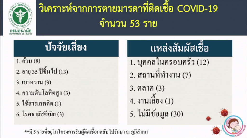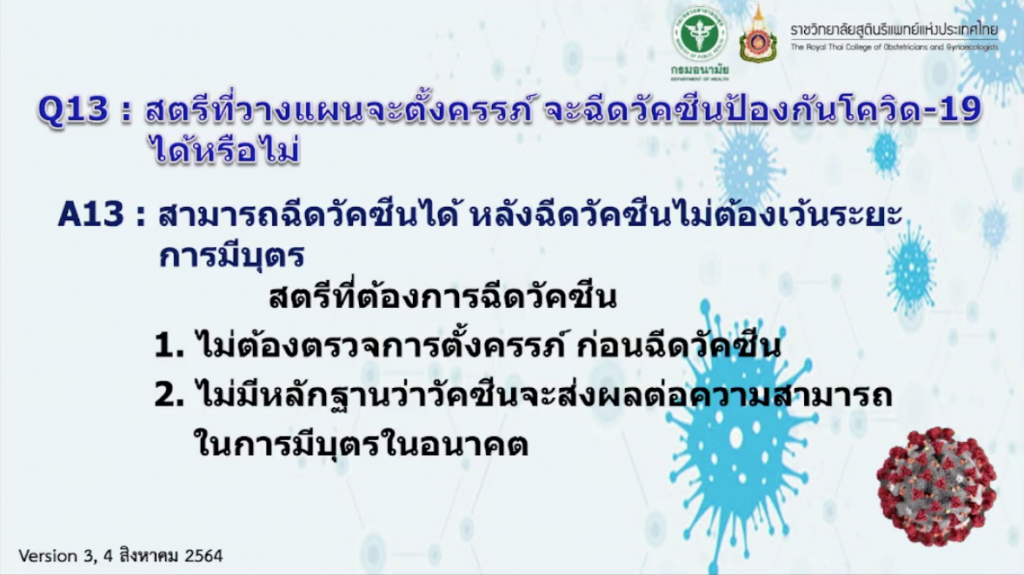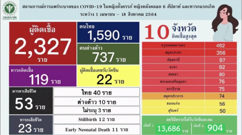 นายแพทย์เอกชัย เพียรศรีวัชรา ผู้อำนวยการสำนักสร้างเสริมสุขภาพ กรมอนามัยเปิดเผยว่า ตัวเลขหญิงตั้งครรภ์เสียชีวิตยังมีทุกวัน เฉลี่ยตั้งแต่วันละ 2 – 3 ราย เด็กในครรภ์เสียชีวิตด้วย ล่าสุดมีหญิงตั้งครรภ์ติดเชื้อยอดทั้งหมด 2,327 ราย เฉลี่ยหญิงตั้งครรภ์ติดเชื้อถึงวันละกว่า 50 ราย เสียชีวิตแล้วถึง 53 ราย ลูกเสียชีวิต 23 ราย ขณะที่หญิงตั้งครรภ์ได้รับการฉีดวัคซีนน้อยมากถึงปัจจุบันเพียง 2 หมื่นกว่าราย และจากสถิติมีหญิงตั้งครรภ์ปีละ 5 แสนราย ทำให้การฉีดวัคซีนในหญิงตั้งครรภ์ยังไม่ถึง 10% จากการวิเคราะห์พบใน 53 รายของสตรีมีครรภ์ที่เสียชีวิตเป็นผู้มีโรคประจำตัว อันดับหนึ่ง คือ แม่มีอายุมากว่า 35 ปี เบาหวาน ความดันสูง และในจำนวนที่เสียชีวิต ฉีดวัคซีนแล้วเพียง 2 รายเท่านั้น ครึ่งหนึ่งของสตรีมีครรภ์ที่ติดเชื้อ ติดจากครอบครัว ส่วน 13 คำถาม-คำตอบ ที่พบบ่อยประเด็นโควิด-19 กับสตรีตั้งครรภ์ คือ