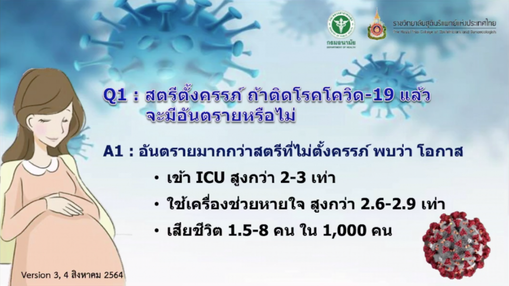 - หญิงตั้งครรภ์ถ้าติดโควิดจะมีอันตรายมากกว่าสตรีปกติ มีโอกาสเข้าไอซียู สูงกว่า 2 – 3 เท่า ใช้เครื่องช่วยหายใจสูงกว่า 2.6 – 2.9 เท่า เสียชีวิต 1.5 – 8 คนใน 1,000 คน