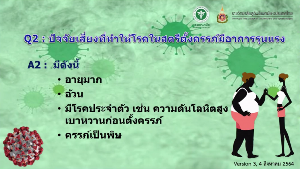 - ปัจจัยเสี่ยงที่ทำให้โรคในหญิงตั้งครรภ์รุนแรงได้แก่อายุมาก อ้วน มีโรคประจำตัว ความดัน เบาหวาน และครรภ์เป็นพิษ
