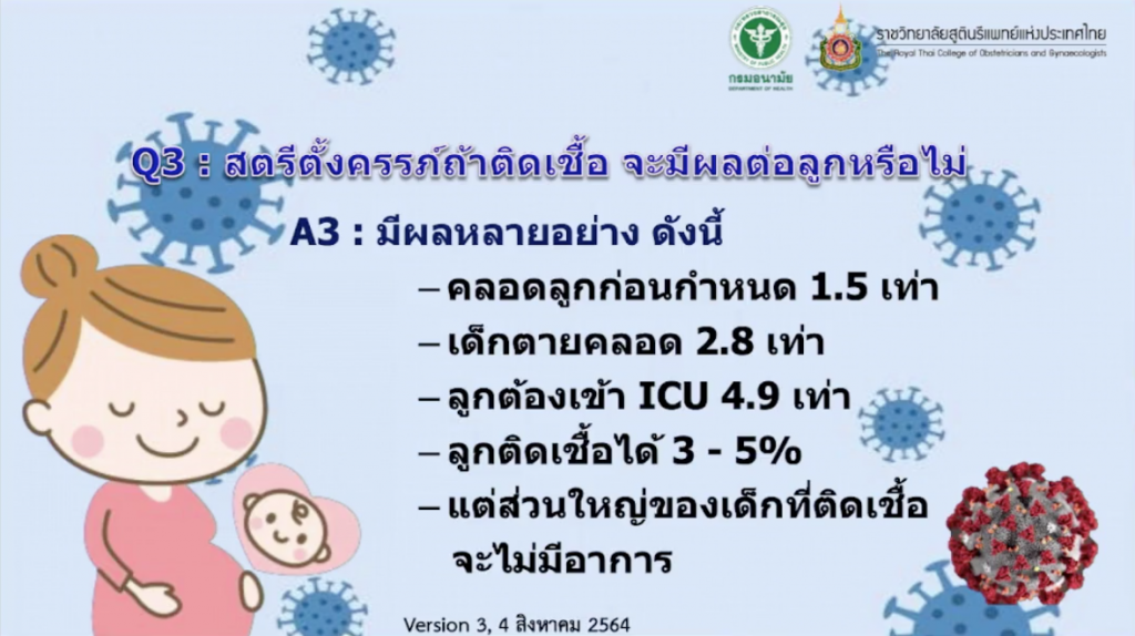 - ถ้าติดเชื้อจะมีผลต่อลูกหลายอย่าง คือ คลอดก่อนกำหนด 1.5 เท่า เด็กตายคลอด 2.8 เท่า ลูกต้องเข้าไอซียู 4.9 เท่า ลูกติดเชื้อได้ 3 – 5%