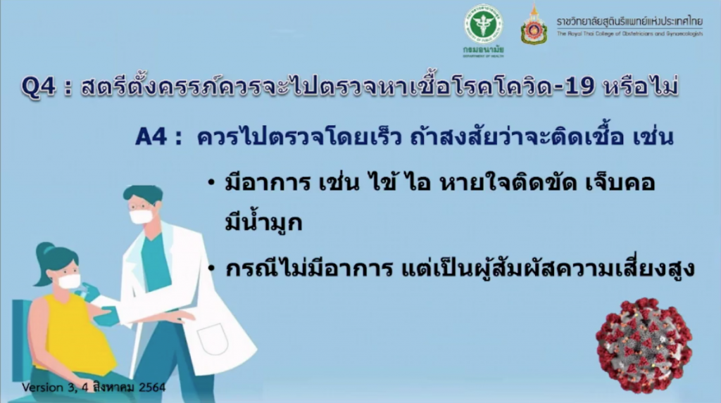 - สตรีตั้งครรภ์ควรตรวจหาเชื้อโควิด-19 โดยเร็วถ้าสงสัยจะติดเชื้อ เช่น มีอาการไข้ ไอ หายใจติดขัด เจ็บคอ มีน้ำมูก หรือไม่มีอาการ แต่เป็นผู้สัมผัสความเสี่ยงสูง