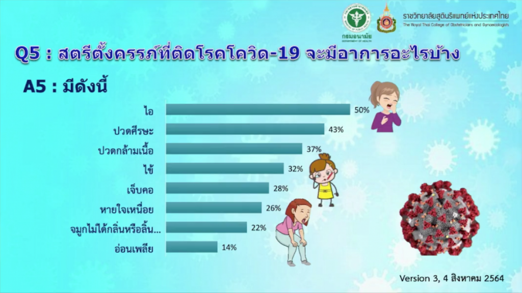 - สตรีตั้งครรภ์ติดโควิดจะมีอาการไอมากที่สุด 50% รองลงมา คือ ปวดศีรษะ ปวดกล้ามเนื้อ ไข้ เจ็บคอ