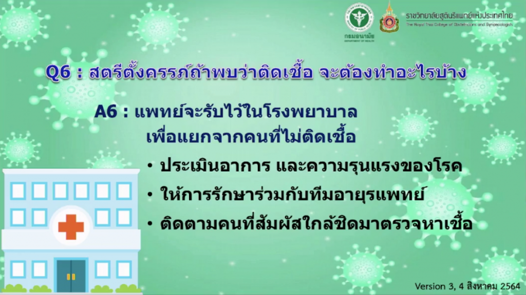 - หญิงตั้งครรภ์ถ้าติดเชื้อหมอจะรับไว้ในโรงพยาบาล เพื่อแยกจากคนที่ไม่ติด ประเมินอาการให้การรักษาและติดตามคนสัมผัสใกล้ชิดมาตรวจหาเชื้อ
