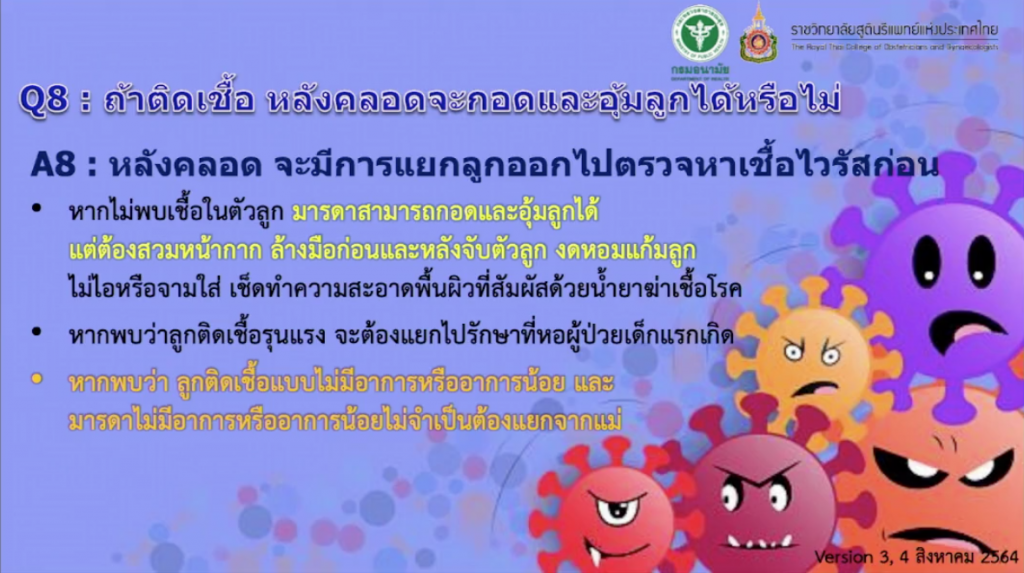 - หลังคลอด จะมีการแยกลูกออกไปตรวจหาเชื้อก่อน หากไม่พบเชื้อในลูก แม่สามารถกอดแล้วอุ้มได้ แต่ต้องสวมหน้ากาก ล้างมือ และงดหอมแก้ม