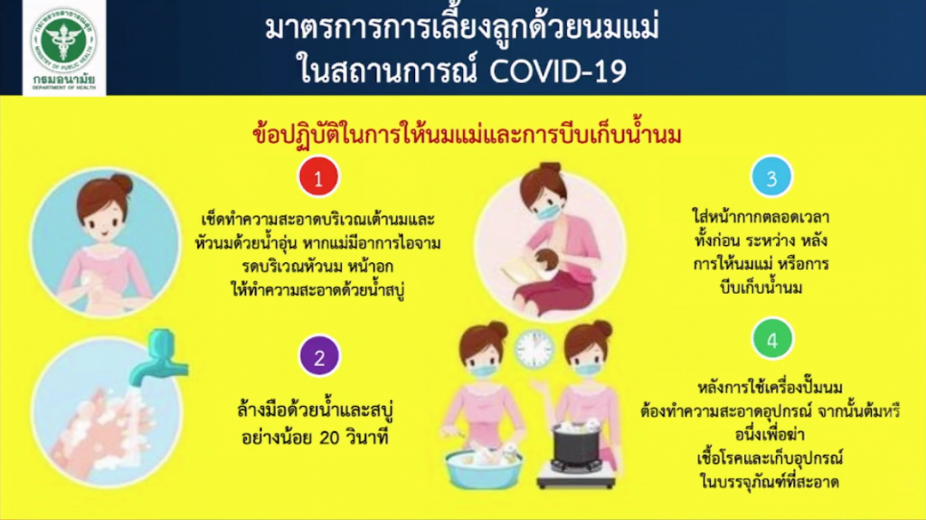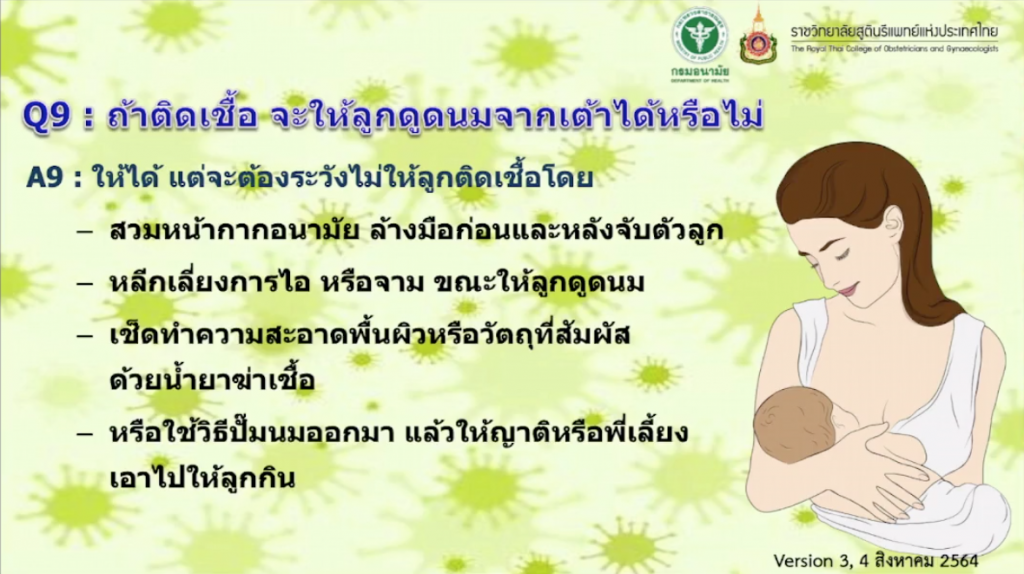 - แม่ติดเชื้อสามารถให้ลูกดูดนมจากเต้าได้ แต่ต้องระวังไม่ให้ลูกติดเชื้อ โดยสวมหน้ากาก ล้างมือก่อนและหลังจับตัวลูก หลีกเลี่ยงไอจามขณะให้ลูกดูดนม เช็ดทำความสะอาดวัสดุรอบข้างหรือใช้วิธีปั๊มนมให้พี่เลี้ยงเอาให้ลูกกิน
