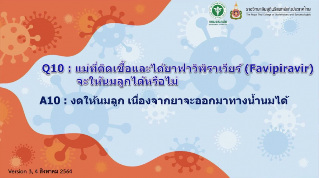 - ถ้าแม่ติดเชื้อและได้ยาฟาวิพิราเวียร์ควรงดให้นมลูกเพราะยาจะออกมาทางน้ำนมได้