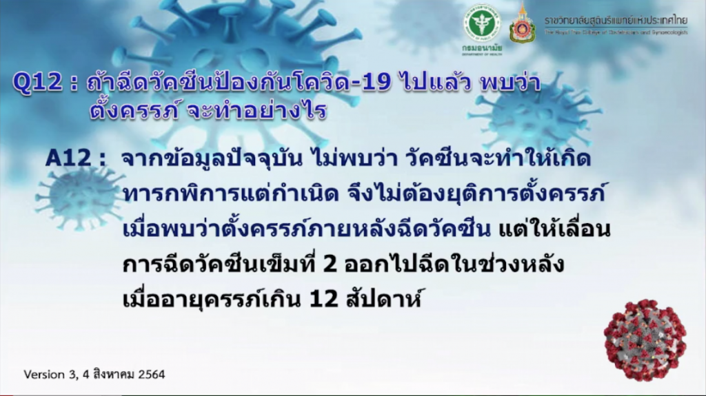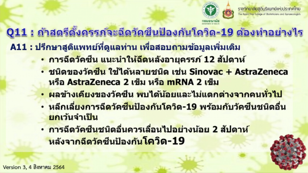 - ถ้าฉีดวัคซีนไปแล้วพบว่าตั้งครรภ์ไม่ต้องตกใจ เพราะข้อมูลยังไม่พบว่าวัคซีนทำให้เกิดทารกพิการ ไม่ต้องยุติการตั้งครรภ์ แต่เมื่อพบว่าตั้งครรภ์หลังฉีดวัคซีนให้เลื่อนเข็มที่สองออกไปฉีดเมื่ออายุครรภ์เกิน 12 สัปดาห์ไปแล้ว