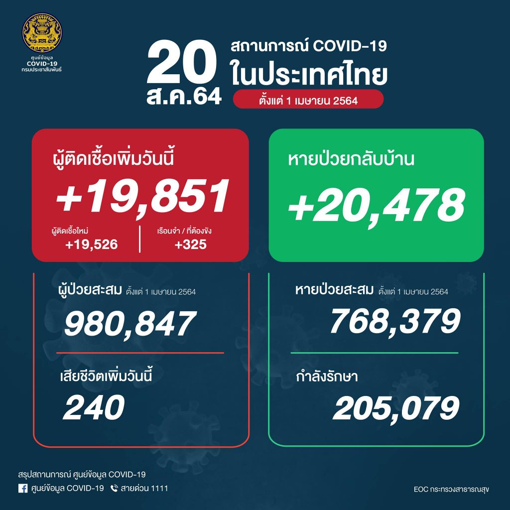 EOC กระทรวงสาธารณสุข รายงานสถานการณ์การติดเชื้อโควิด-19 รายใหม่ วันนี้ (20 ส.ค.) พบยอดผู้ติดเชื้อใหม่รวม 19,851 ราย จำแนกเป็นติดเชื้อใหม่ 19,526 ราย ติดเชื้อภายในเรือนจำ/ที่ต้องขัง 325 ราย ยืนยันสะสม 980,847 ราย (ตั้งแต่ 1 เมษายน) หายป่วยกลับบ้าน 20,478 ราย มีผู้เสียชีวิตเพิ่ม 240 ราย