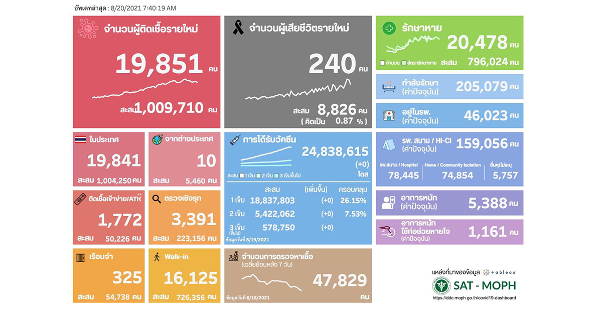 กรุงเทพฯ 20 ส.ค.- โควิดวันนี้ ไทยติดเชื้อสะสมตั้งแต่ระลอกแรกทะลุ 1 ล้านราย ติดเชื้อเพิ่ม 19,851 ราย ตายอีก 240 ราย
