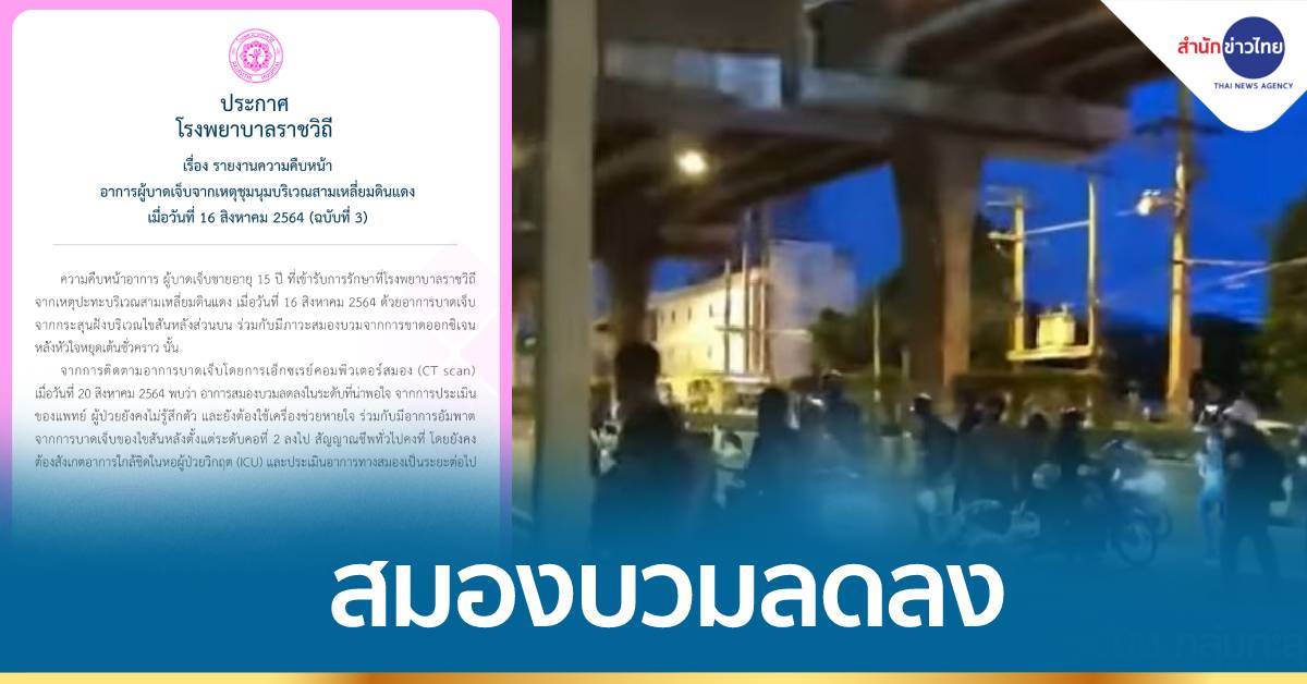 จากการติดตามอาการบาดเจ็บโดยการเอ็กซเรย์คอมพิวเตอร์สมอง (CT scan) เมื่อวันที่ 20 สิงหาคม 2564 พบว่า อาการสมองบวมลดลงในระดับที่น่าพอใจ จากการประเมินของแพทย์ ผู้ป่วยยังคงไม่รู้สึกตัว และยังต้องใช้เครื่องช่วยหายใจ ร่วมกับมีอาการอัมพาตจากการบาดเจ็บของไขสันหลังตั้งแต่ระดับคอที่ 2 ลงไป สัญญาณชีพทั่วไปคงที่ โดยยังคงต้องสังเกตอาการใกล้ชิดในหอผู้ป่วยวิกฤต (ICU) และประเมินอาการทางสมองเป็นระยะต่อไป.-สำนักข่าวไทย