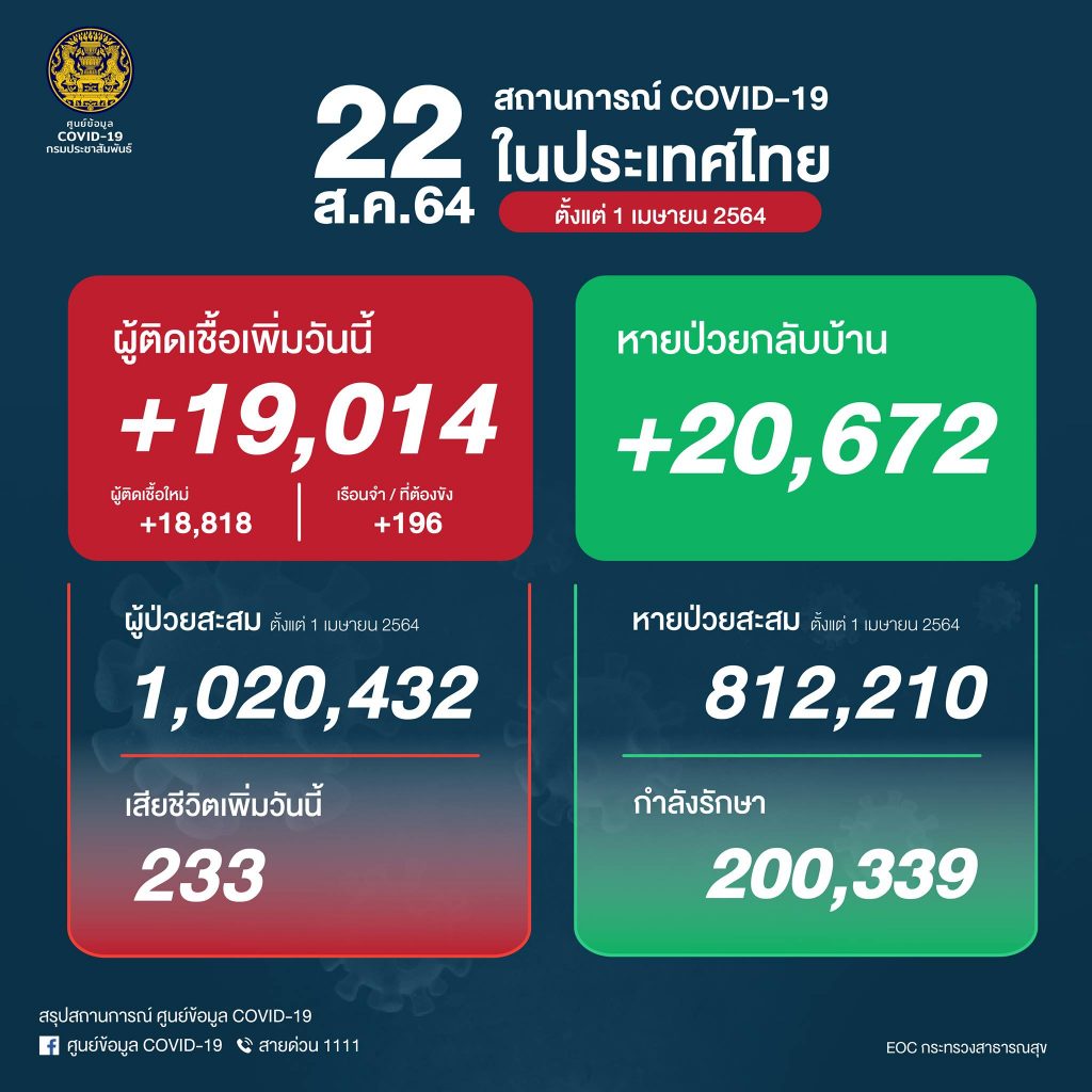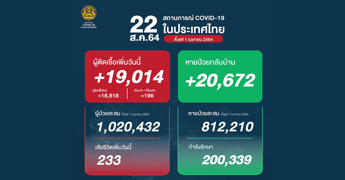 กรุงเทพฯ 22 ส.ค.- โควิดวันนี้ ยอดเสียชีวิตยังสูง 233 ราย ติดเชื้อรวม 19,014 ราย หายป่วยกลับบ้าน 20,672 ราย