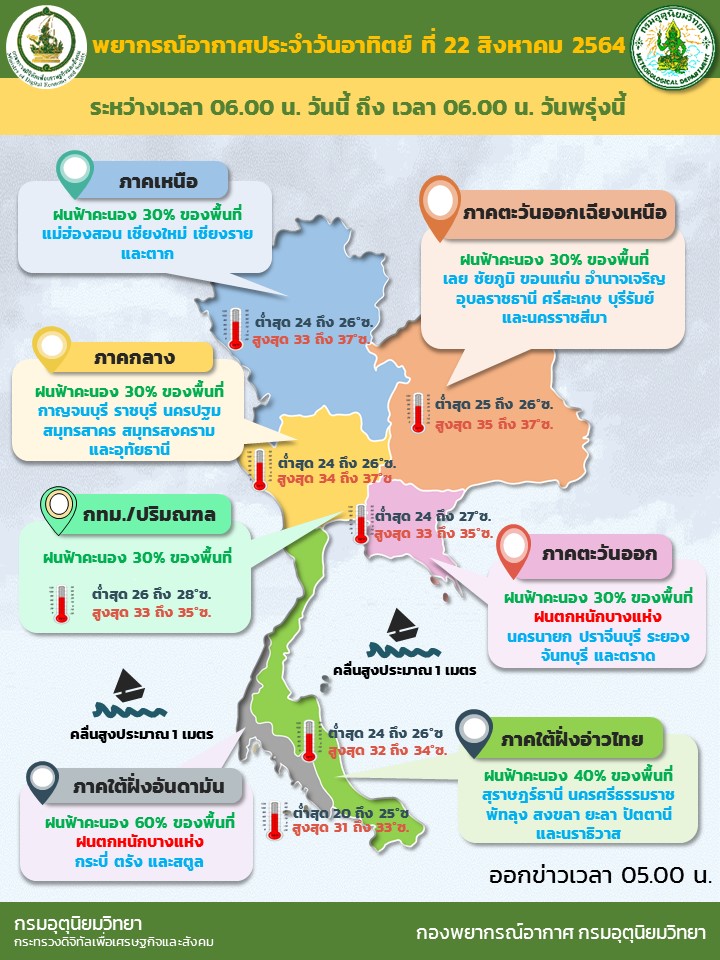 สำนักข่าวไทย 22 ส.ค.-กรมอุตุนิยมวิทยา เตือนทั่วไทยยังมีฝนฟ้าคะนอง ภาคใต้ตกหนัก ส่วน. กทม.-ปริมณฑล ฝนฟ้าคะนองร้อยละ 30