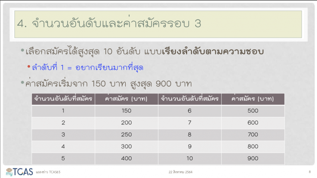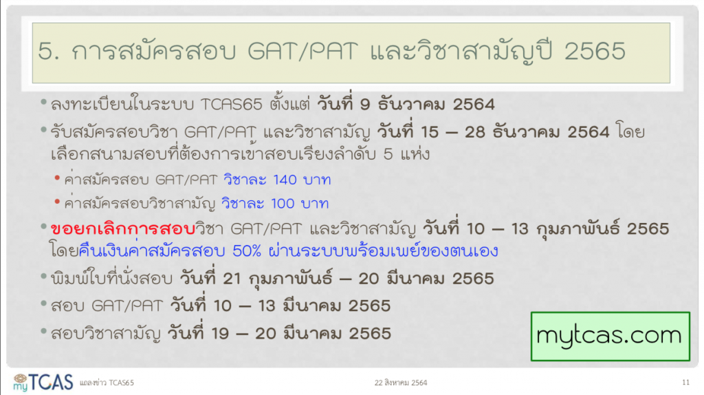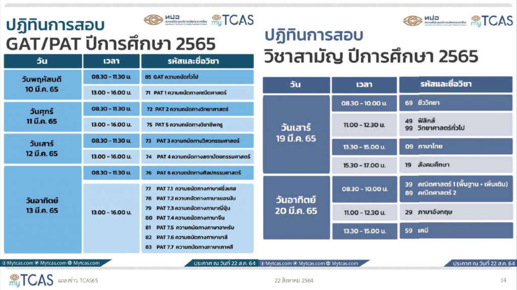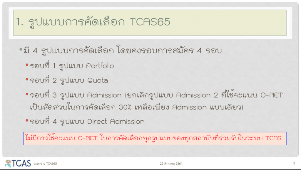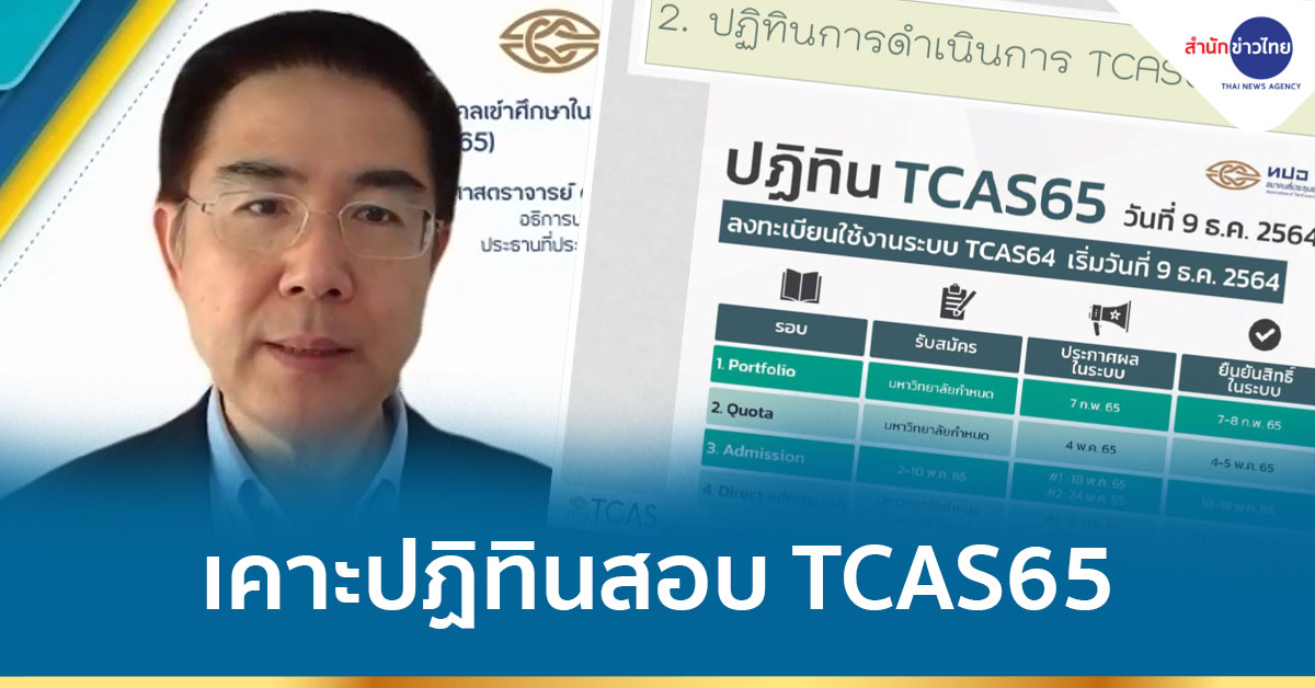 สำนักข่าวไทย 22 ส.ค. – ทปอ. เคาะปฏิทินสอบ TCAS65 คง 4 รอบการรับสมัครเข้ามหาวิทยาลัย โดยทุกรอบไม่นำคะแนน O-NET มาใช้ และอัตราค่าสอบเท่าเดิม ส่วนการสอบในรอบ 3 และ 4 ยืนยันเนื้อหาข้อสอบเน้นแก่น คิด วิเคราะห์ ไม่เน้นรายละเอียด เพื่อให้สอดคล้องสถานการณ์โควิด-19 ที่การเรียนการสอนปรับมาเป็นระบบออนไลน์
