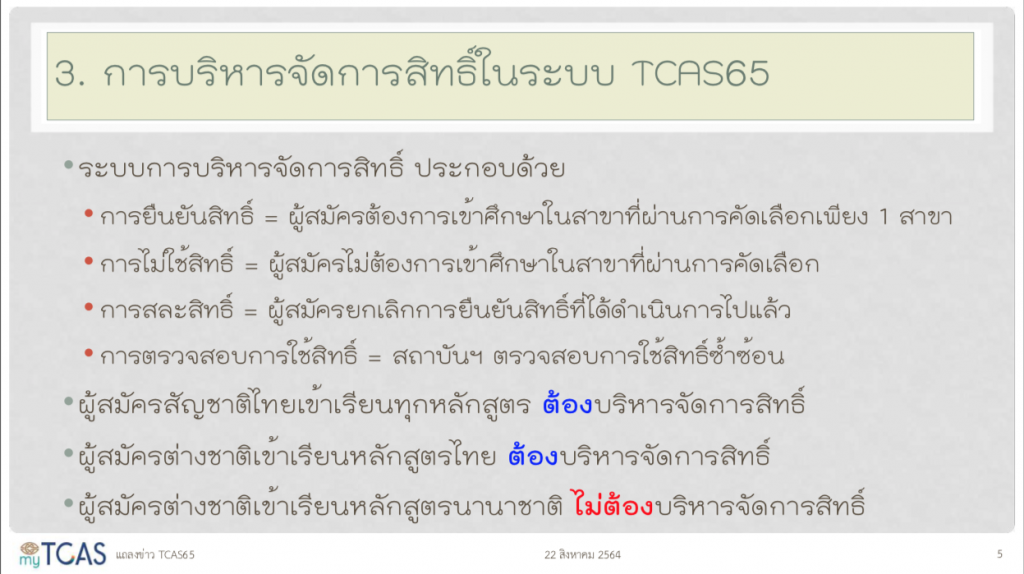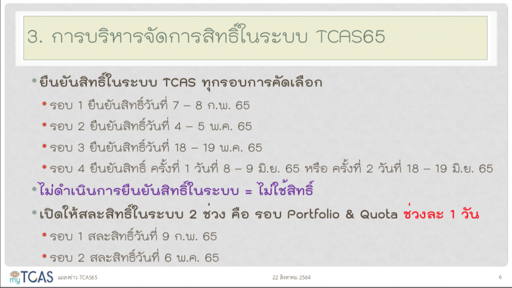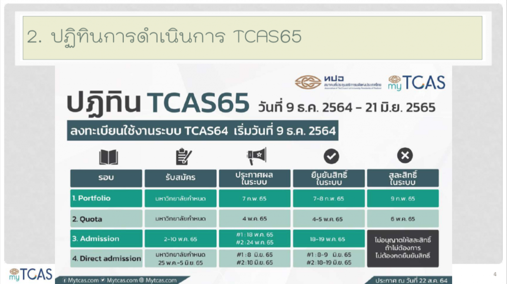 ส่วนปฏิทินการรับสมัครนั้น เริ่มลงทะเบียนวันที่ 9 ธ.ค.64 โดยรอบ1 Portfolio มหาวิทยาลัยเป็นผู้กำหนดวันรับสมัคร ประกาศผล 7 ก.พ.65 ยืนยันสิทธิ 7-8 ก.พ.65 สละสิทธิ 9 ก.พ.65 รอบ2 Quota มหาวิทยาลัยเป็นผู้กำหนดวันรับสมัคร ประกาศผล 4 พ.ค.65 ยืนยันสิทธิ 4-5 พ.ค.65 สละสิทธิ 6 พ.ค.65 รอบ3 สอบ Admission 1 สมัคร 2-10 พ.ค.65 ประกาศผลสองครั้ง คือ 18 พ.ค.65 ยืนยันสิทธิ 18-19 พ.ค.65 และ 24 พ.ค. รอบ4 Direct Admission สมัคร 25 พ.ค.-5 มิ.ย.65 ประกาศผล 2 ครั้ง คือ 8 มิ.ย.65 ยืนยันสิทธิ 8-9 มิ.ย.65 และ 18 มิ.ย.65 ยืนยันสิทธิ 18-19 มิ.ย.65 ทั้งนี้ทุกรอบของการสมัครในการสละสิทธิ ต้องดำเนินการทันที หลังมีการประกาศผล 1 วัน เพื่อให้ตรงตามประสงค์ของการสมัคร 1 คน 1 สิทธิ