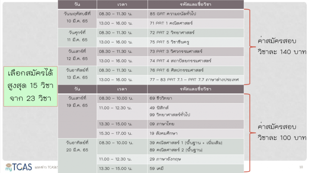 ดร. พีระพงศ์ กล่าวว่า สำหรับการสมัครสอบ Admission 1 ยังคงเหมือนเดิม เปิดให้เลือกสมัครสอบได้ 10 อันดับ และเสียอัตราค่าสมัครเท่าเดิม เริ่มต้นอันดับที่ 1 จำนวน 150 บาท และสิ้นสุดอันดับที่ 10 จำนวน 900 บาท ส่วนวิชาที่สอบ คือ แกต/แพต วิชาละ 140 บาท วิชาสามัญ วิชาละ 100 บาท สมัครในระบบทีแคส 15-28 ธ.ค.64 แกต/แพต สอบ10-13 มี.ค.65 วิชาสามัญ สอบ 19-20 มี.ค.65 ประกาศผลสอบแกต/แพต 18 เม.ย.65 วิชาสามัญ 20 เม.ย.65 ทั้งนี้นักเรียนที่สงสัยเกี่ยวกับคะแนนสอบ สามารถยื่นคำร้องขอทบทวนผลสอบผ่านระบบออนไลน์ 21-28 เม.ย. ซึ่งมีค่าธรรมเนียมการขอดูข้อสอบด้วย