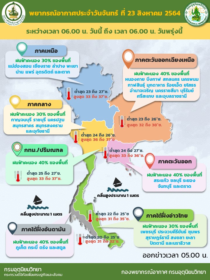 กรมอุตุฯ 23 ส.ค. – กรมอุตุฯ เผยทั่วไทยยังคงมีฝนฟ้าคะนองในระยะนี้ ส่วนกรุงเทพฯ และปริมณฑล ฝนฟ้าคะนอง 40% ของพื้นที่