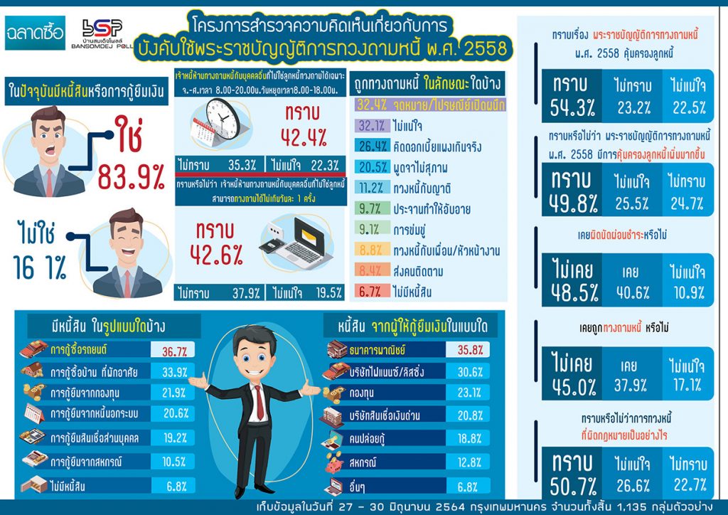 นิตยสารฉลาดซื้อ มูลนิธิเพื่อผู้บริโภค ร่วมกับศูนย์สำรวจความคิดเห็นบ้านสมเด็จโพลล์ สถาบันวิจัยและพัฒนา มหาวิทยาลัยราชภัฏบ้านสมเด็จเจ้าพระยา ได้ดำเนินโครงการสำรวจความคิดเห็นเกี่ยวกับการบังคับใช้พระราชบัญญัติการทวงถามหนี้ พ.ศ. 2558 โดยเก็บจากกลุ่มตัวอย่างจากประชาชนที่อาศัยอยู่ในจังหวัดกรุงเทพมหานคร จำนวนทั้งสิ้น 1,135 กลุ่มตัวอย่าง เก็บข้อมูลในวันที่ 27 – 30 มิถุนายน 2564 กลุ่มตัวอย่างในการสำรวจครั้งนี้ใช้เกณฑ์ตารางสำเร็จรูปของ Taro Yamane กำหนดว่า ประชากรเกิน 100,000 คนต้องการความเชื่อมั่น 95% และความผิดพลาดไม่เกิน 3% ต้องใช้กลุ่มตัวอย่างจำนวน 1,111 กลุ่มตัวอย่าง