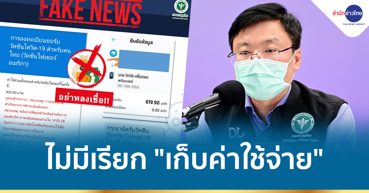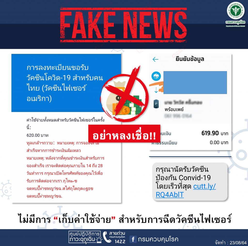 วันนี้ (23 สิงหาคม 2564) นายแพทย์โสภณ เอี่ยมศิริถาวร รองอธิบดีกรมควบคุมโรค กระทรวงสาธารณสุข (สธ.) กล่าวว่า ตามที่มีการส่งข้อความผ่านทาง SMS ให้ลงทะเบียนรับวัคซีนป้องกันโรคโควิดไฟเซอร์ โดยระบุว่า ต้องเสียค่าใช้จ่ายนั้น ไม่เป็นความจริง โดยการจัดหาวัคซีนให้กับประชาชนเพื่อป้องกันโรค และสร้างภูมิคุ้มกันหมู่ให้เกิดขึ้นนั้น ขอย้ำว่า ประชาชนไม่ต้องเสียค่าใช้จ่ายในการรับวัคซีน อย่างไรก็ตาม หากพบเห็นการเรียกเก็บค่าใช้จ่ายฉีดวัคซีนไฟเซอร์ ขอให้แจ้งเจ้าหน้าที่ตรวจสอบทันที