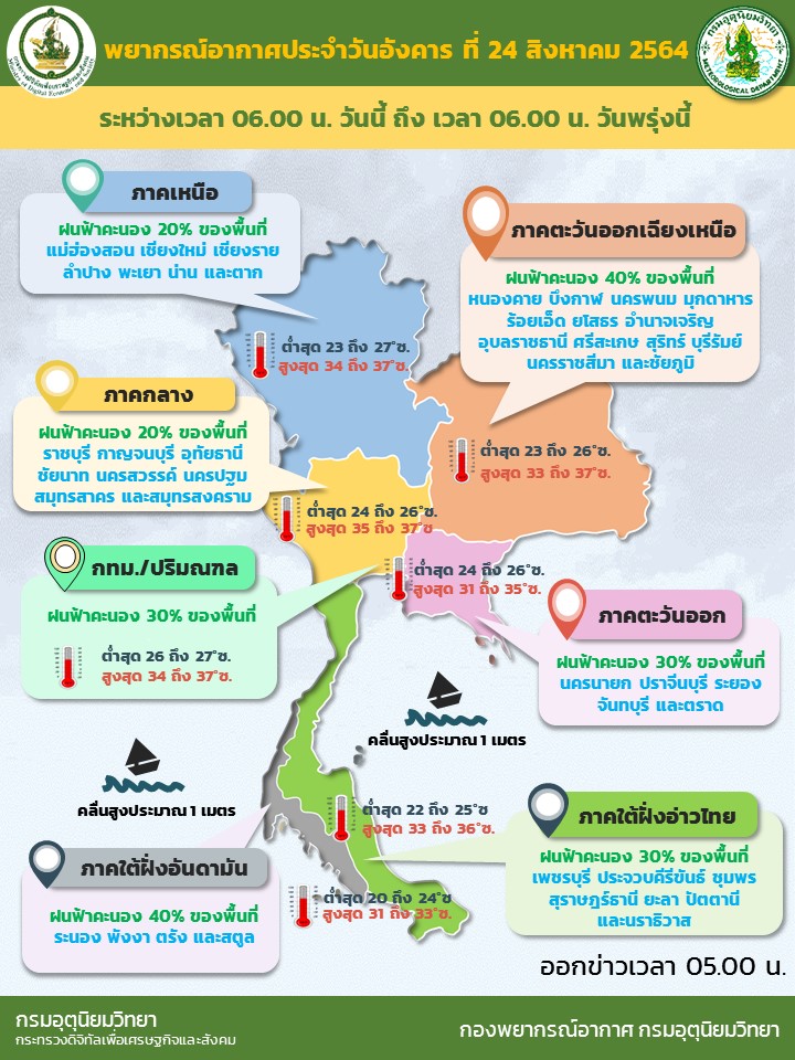 กรมอุตุฯ 24 ส.ค. – กรมอุตุฯ เผยทั่วไทยยังคงมีฝนฟ้าคะนองในระยะนี้ ส่วนกรุงเทพฯ และปริมณฑล ฝนฟ้าคะนอง 30% ของพื้นที่