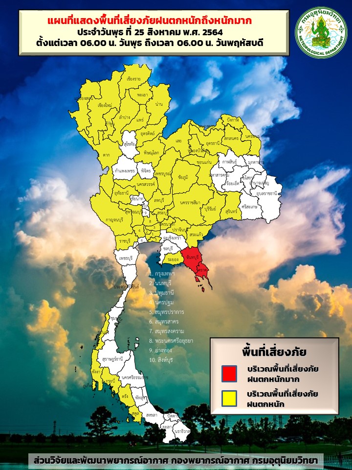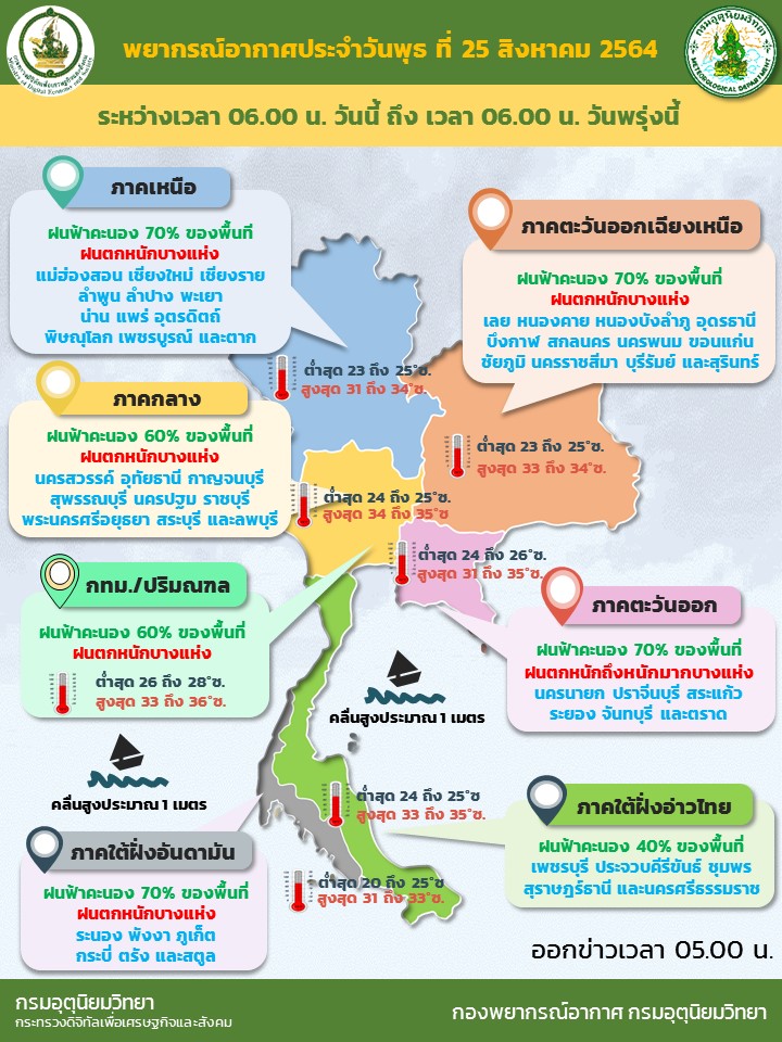 อนึ่ง ในช่วงวันที่ 25-29 ส.ค.64 จะมีร่องมรสุมเลื่อนลงมาพาดผ่านภาคเหนือ ภาคกลาง และภาคตะวันออกเฉียงเหนือ ทำให้บริเวณประเทศไทยตอนบนมีฝนเพิ่มขึ้น และมีฝนตกหนักถึงหนักมากบางแห่ง ขอให้ประชาชนบริเวณพื้นที่เสี่ยงภัยระวังอันตรายจากฝนตกหนักและฝนที่ตกสะสม ซึ่งอาจทำให้เกิดน้ำท่วมฉับพลันและน้ำป่าไหลหลาก