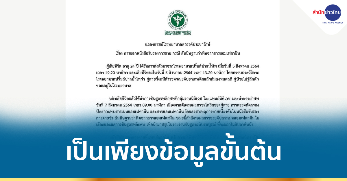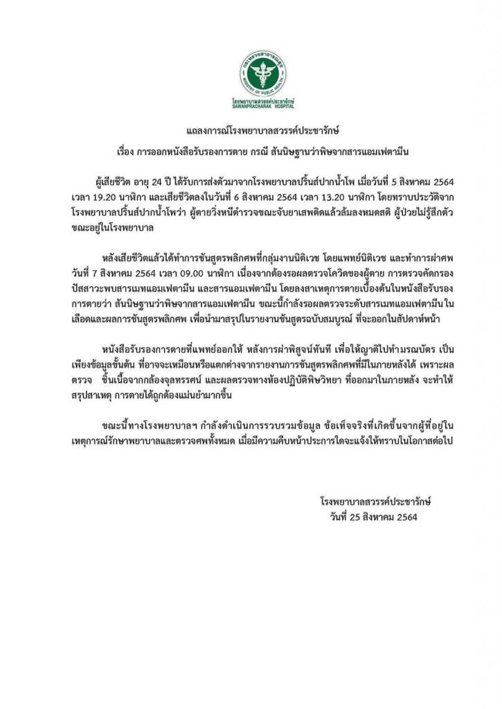 เฟซบุ๊ก รพ.สวรรค์ประชารักษ์ ได้ออกแถลงการณ์ เรื่อง การออกหนังสือรับรองการตาย กรณีสันนิษฐานว่าพิษจากสารแอมเฟตามีน โดยใจความระบุว่า ผู้เสียชีวิตอายุ 24 ปีได้รับการส่งตัวมาจากโรงพยาบาลปริ้นส์ปากน้ำโพ เมื่อวันที่ 5 ส.ค. 2564 เวลา 19.20 น. และเสียชีวิตลงในวันที่ 6 ส.ค. 2564 เวลา 13.00 น. โดยทราบประวัติจากโรงพยาบาลปริ้นส์ปากน้ำโพ ว่าผู้ตายวิ่งหนีตำรวจขณะจับยาเสพติดแล้วล้มลงหมดสติ ผู้ป่วยไม่รู้สึกตัวขณะอยู่โรงพยาบาล