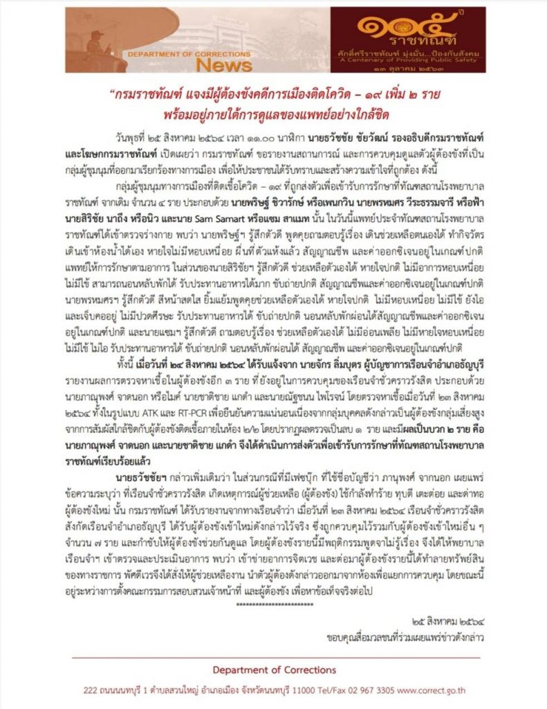 กลุ่มผู้ชุมนุมทางการเมืองที่ติดเชื้อโควิด-19 ที่ถูกส่งตัวเพื่อเข้ารับการรักษาที่ทัณฑสถานโรงพยาบาลราชทัณฑ์ จากเดิมจำนวน 4 ราย ประกอบด้วย นายพริษฐ์ ชิวารักษ์ หรือเพนกวิน นายพรหมศร วีระธรรมจารี หรือฟ้า นายสิริชัย นาถึง หรือนิว และนาย Sam Samart หรือแซม สาแมท นั้น ในวันนี้แพทย์ประจำทัณฑสถานโรงพยาบาลราชทัณฑ์ได้เข้าตรวจร่างกาย พบว่า นายพริษฐ์ รู้สึกตัวดี พูดคุยถามตอบรู้เรื่อง เดินช่วยเหลือตนเองได้ ทำกิจวัตร เดินเข้าห้องน้ำได้เอง หายใจไม่มีหอบเหนื่อย ผื่นที่ตัวแห้งแล้ว สัญญาณชีพ และค่าออกซิเจนอยู่ในเกณฑ์ปกติ แพทย์ให้การรักษาตามอาการ ในส่วนของนายสิริชัย รู้สึกตัวดี ช่วยเหลือตัวเองได้ หายใจปกติ ไม่มีอาการหอบเหนื่อย ไม่มีไข้ สามารถนอนหลับพักได้ รับประทานอาหารได้มาก ขับถ่ายปกติ สัญญาณชีพและค่าออกซิเจนอยู่ในเกณฑ์ปกติ นายพรหมศร รู้สึกตัวดี สีหน้าสดใส ยิ้มแย้มพูดคุยช่วยเหลือตัวเองได้ หายใจปกติ ไม่มีหอบเหนื่อย ไม่มีไข้ ยังไอและเจ็บคออยู่ ไม่มีปวดศีรษะ รับประทานอาหารได้ ขับถ่ายปกติ นอนหลับพักผ่อนได้สัญญาณชีพและค่าออกซิเจนอยู่ในเกณฑ์ปกติ และนายแซม รู้สึกตัวดี ถามตอบรู้เรื่อง ช่วยเหลือตัวเองได้ ไม่มีอ่อนเพลีย ไม่มีหายใจหอบเหนื่อย ไม่มีไข้ ไม่ไอ รับประทานอาหารได้ ขับถ่ายปกติ นอนหลับพักผ่อนได้ สัญญาณชีพ และค่าออกซิเจนอยู่ในเกณฑ์ปกติ
