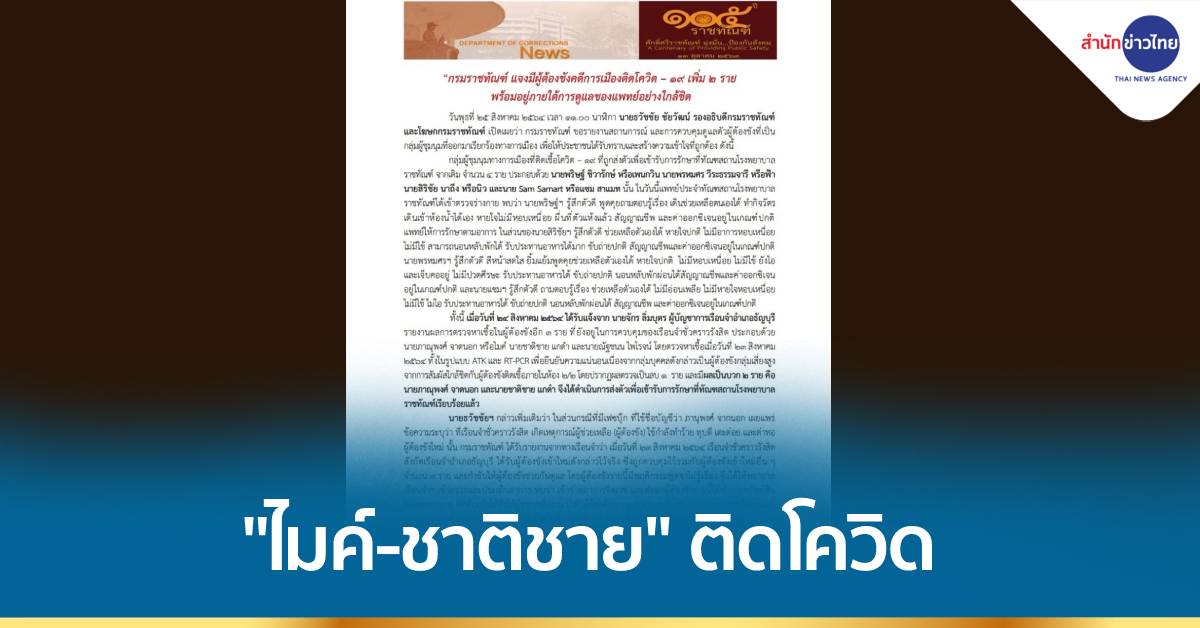 กทม. 25 ส.ค.-กรมราชทัณฑ์ เผยมีผู้ต้องขังคดีการเมืองติดโควิดเพิ่ม 2 ราย คือ “ไมค์” และ “ชาติชาย” พร้อมอยู่ภายใต้การดูแลของแพทย์อย่างใกล้ชิด ส่วน “เพนกวิน” อาการดีขึ้นตามลำดับ