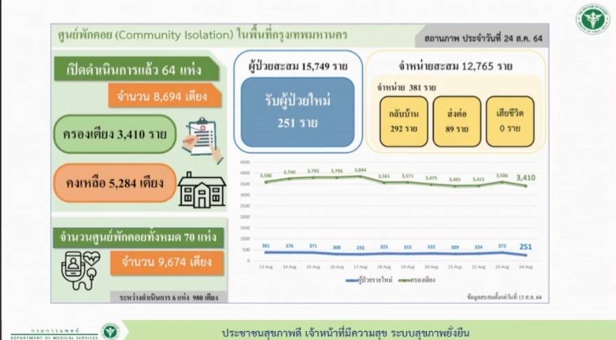 นพ.สมศักดิ์ อรรฆศิลป์ อธิบดีกรมการแพทย์ กล่าวถึงสถานการณ์เตียงและจำนวนคนป่วยติดเชื้อโควิด -19 ว่า ขณะนี้อัตราการหายป่วยของผู้ป่วยมากขึ้น เฉลี่ย 20,000 คนต่อวัน ยังไม่นับรวมผู้ป่วยที่รักษาใน Home Isolation (HI) สถานการณ์โดยรวมถือว่าดีขึ้นมาก ทั้งการบริหารจัดการเตียงผู้ป่วยในทุกกลุ่มสี โดยเฉพาะจำนวนผู้ป่วยสีเหลือง ถือว่าการบริหารจัดการดี เหลือเพียง การบริการจัดการในส่วนผู้ป่วยเตียงสีแดง (ICU) ซึ่งในส่วนของ กทม.ต้องประคองไม่มีอัตราป่วย ICU เกิน 1,000 เตียงไม่เช่นนั้นการบริหารจัดการจะลำบาก พร้อมกล่าวว่าขณะนี้อัตราการป่วยใน กทม. เหลือเฉลี่ย วันละ 4,000 คนต่อวัน ถือว่าดีขึ้น ส่วนในต่างจังหวัด แม้พบจำนวนผู้ป่วยเพิ่มมากขึ้น แต่การบริหารจัดแบบเบ็ดเสร็จทำให้ไม่ค่อยมีปัญหามากนัก