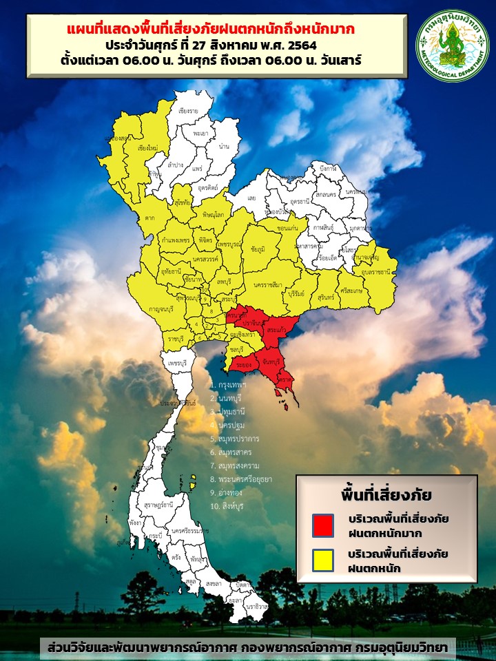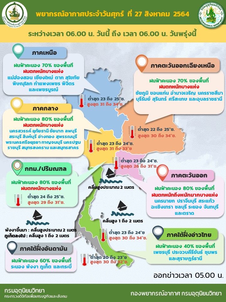 กรมอุตุนิยมวิทยา พยากรณ์อากาศ 24 ชั่วโมงข้างหน้า ร่องมรสุมพาดผ่านภาคเหนือตอนล่าง ภาคกลาง ภาคตะวันออก และภาคตะวันออกเฉียงเหนือตอนล่าง เข้าสู่หย่อมความกดอากาศต่ำบริเวณประเทศกัมพูชา ประกอบกับมรสุมตะวันตกเฉียงใต้ที่พัดปกคลุมทะเลอันดามัน ประเทศไทย และอ่าวไทย มีกำลังปานกลาง ลักษณะเช่นนี้ทำให้ประเทศไทยยังคงมีฝนตกต่อเนื่อง กับมีฝนตกหนักถึงหนักมากบางแห่ง ขอให้ประชาชนที่อาศัยในพื้นที่เสี่ยงภัย บริเวณภาคเหนือ ภาคตะวันออกเฉียงเหนือ ภาคตะวันออก และภาคใต้ฝั่งตะวันตก ระวังอันตรายจากฝนตกหนักและฝนที่ตกสะสม ซึ่งอาจทำให้เกิดน้ำท่วมฉับพลันและน้ำป่าไหลหลากในระยะนี้