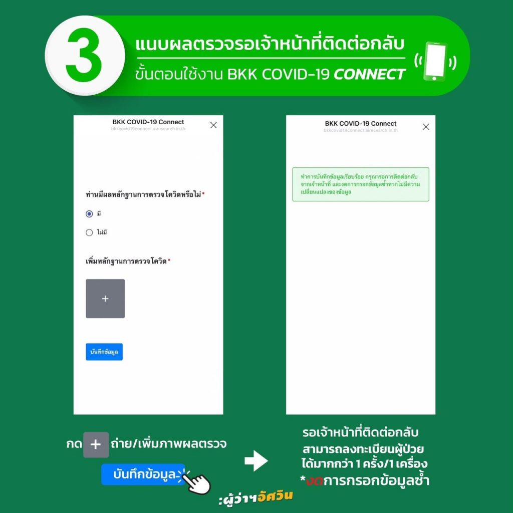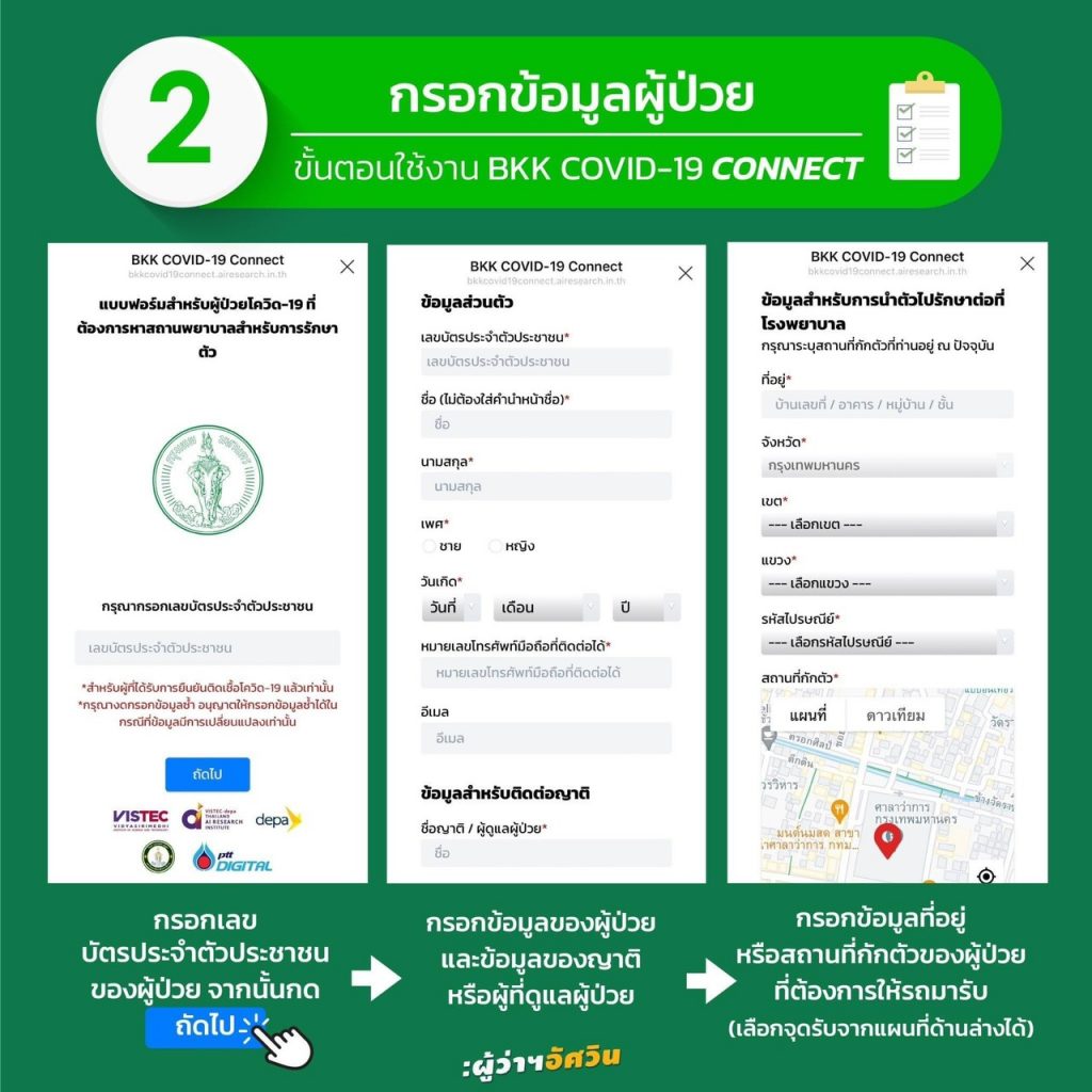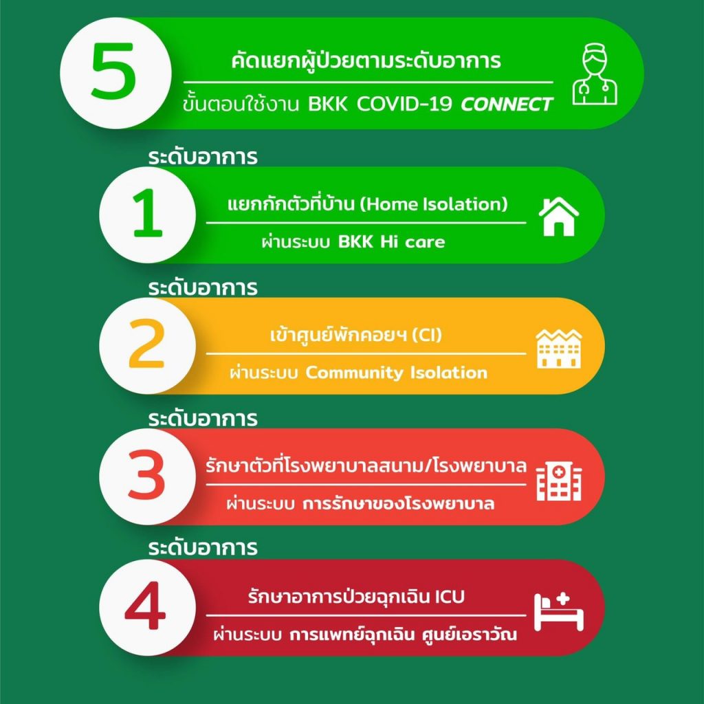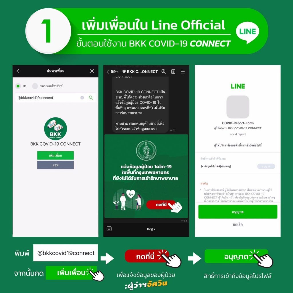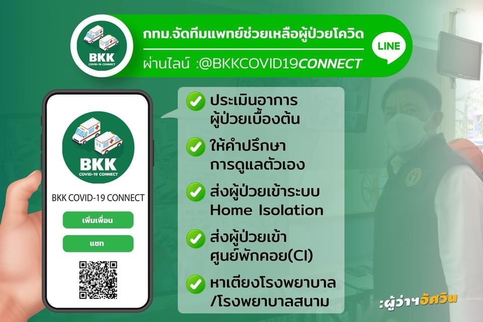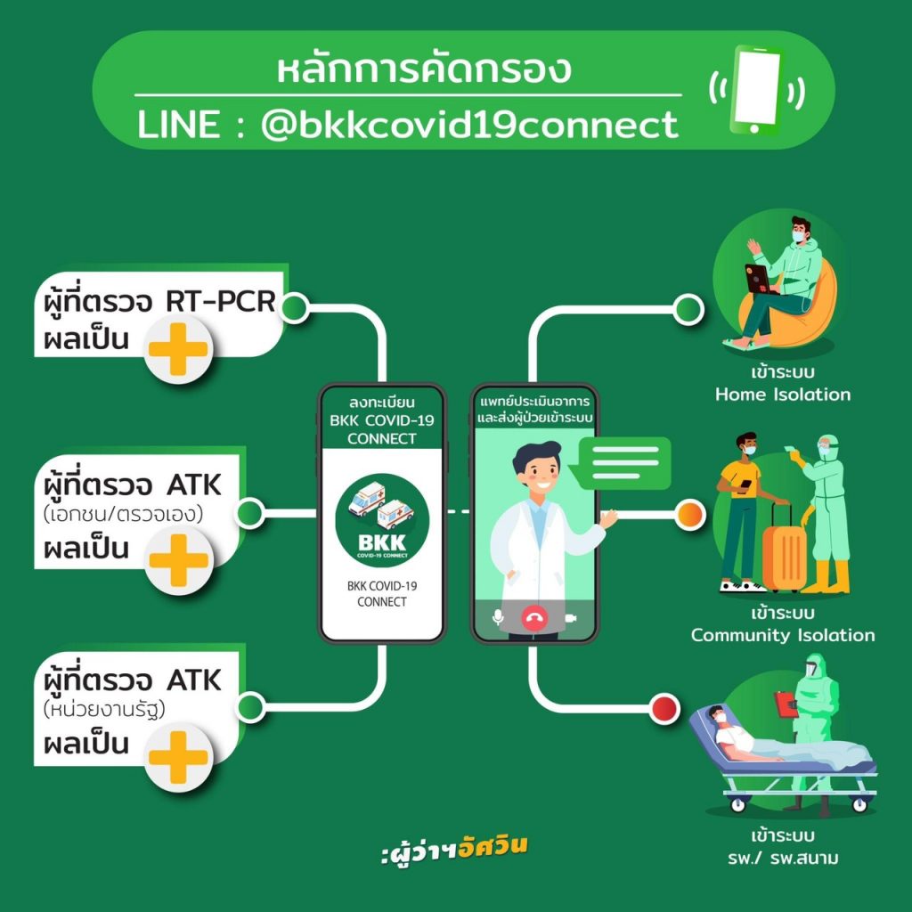 กรุงเทพมหานคร ทำระบบแจ้งส่งผู้ป่วยเข้ารักษาในโรงพยาบาล โดยใช้ LINE@BKKCOVID19CONNECT เพื่อเป็นช่องทางในการคัดกรองสำหรับผู้ป่วยที่มีผล RT-PCR เป็นบวก ผู้ป่วยที่มีผล ATK จากการตรวจเองหรือสถานพยาบาลเอกชนเป็นบวก และผู้ป่วยที่มีผล ATK จากการตรวจโดยหน่วยงานของรัฐเป็นบวก ซึ่งผู้ป่วยหรือญาติผู้ป่วยซึ่งมีข้อมูลส่วนตัวของผู้ป่วย อาทิ ชื่อ-สกุล วันเดือนปีเกิด และหมายเลขบัตรประจำตัวประชาชนผู้ป่วย สามารถเป็นผู้กรอกข้อมูลในระบบแทนได้
