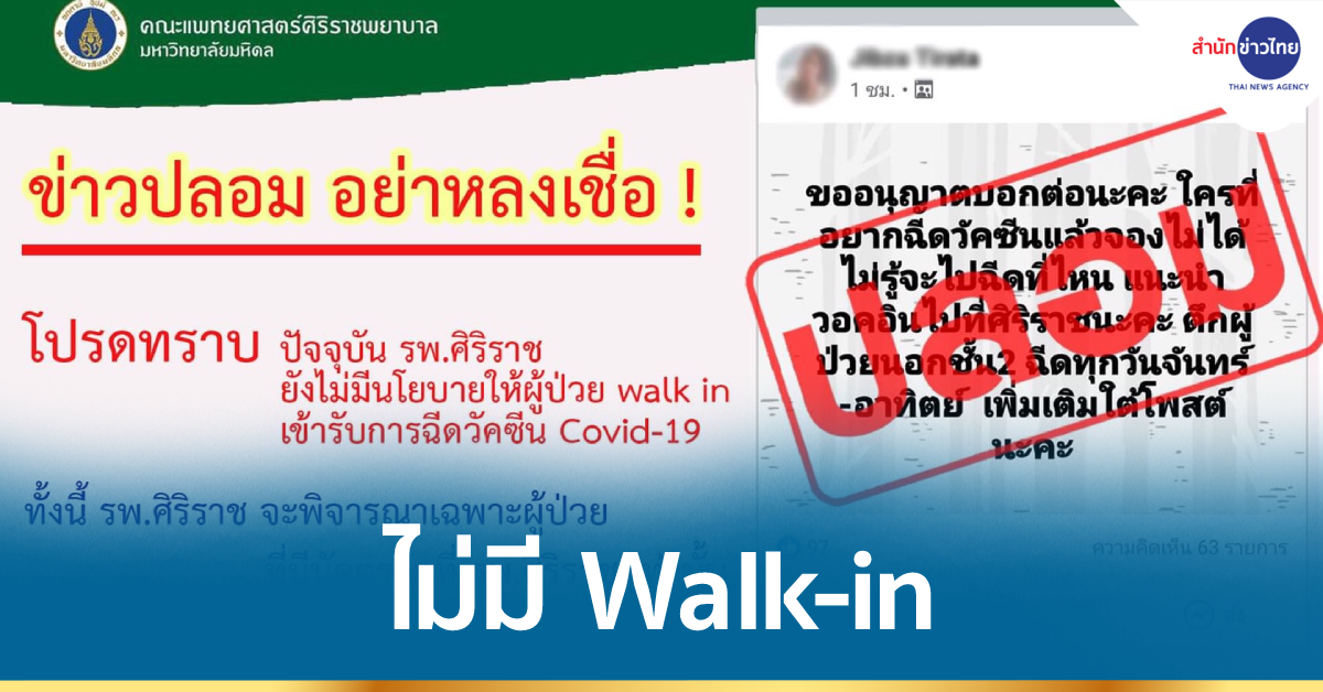 จากการตรวจสอบพบว่า “ปัจจุบัน รพ.ศิริราช ยังไม่มีนโยบายให้ผู้ป่วย walk in เข้ารับการฉีดวัคซีนป้องกันโรค Covid-19 ได้ ทั้งนี้ รพ.ศิริราช จะพิจารณาเฉพาะผู้ป่วยที่มีนัดตรวจที่ รพ.ศิริราช เท่านั้น” ผู้ใช้บริการสามารถติดตามข้อมูลข่าวสารของคณะแพทยศาสตร์ศิริราชพยาบาล มหาวิทยาลัยมหิดลได้ที่ เว็บไซต์ https://www.si.mahidol.ac.th และ Facebook : https://www.facebook.com/siriraj.-สำนักข่าวไทย