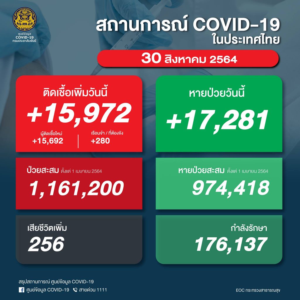EOC กระทรวงสาธารณสุข รายงานสถานการณ์การติดเชื้อโควิด-19 รายใหม่ วันนี้ (30 ส.ค.) พบยอดผู้ติดเชื้อใหม่รวม 15,972 ราย จำแนกเป็นติดเชื้อใหม่ 15,692 ราย ติดเชื้อภายในเรือนจำ/ที่ต้องขัง 280 ราย ยืนยันสะสม 1,161,200 ราย (ตั้งแต่ 1 เมษายน) หายป่วยกลับบ้าน 17,281 ราย มีผู้เสียชีวิตเพิ่ม 256 ราย .-สำนักข่าวไทย