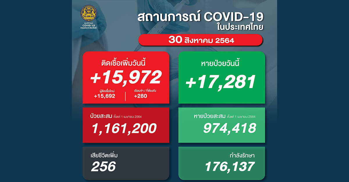 กรุงเทพฯ 30 ส.ค.- โควิดวันนี้ ยอดเสียชีวิตยังสูง 256 ราย ติดเชื้อใหม่ 15,972 ราย หายป่วยกลับบ้าน 17,281 ราย