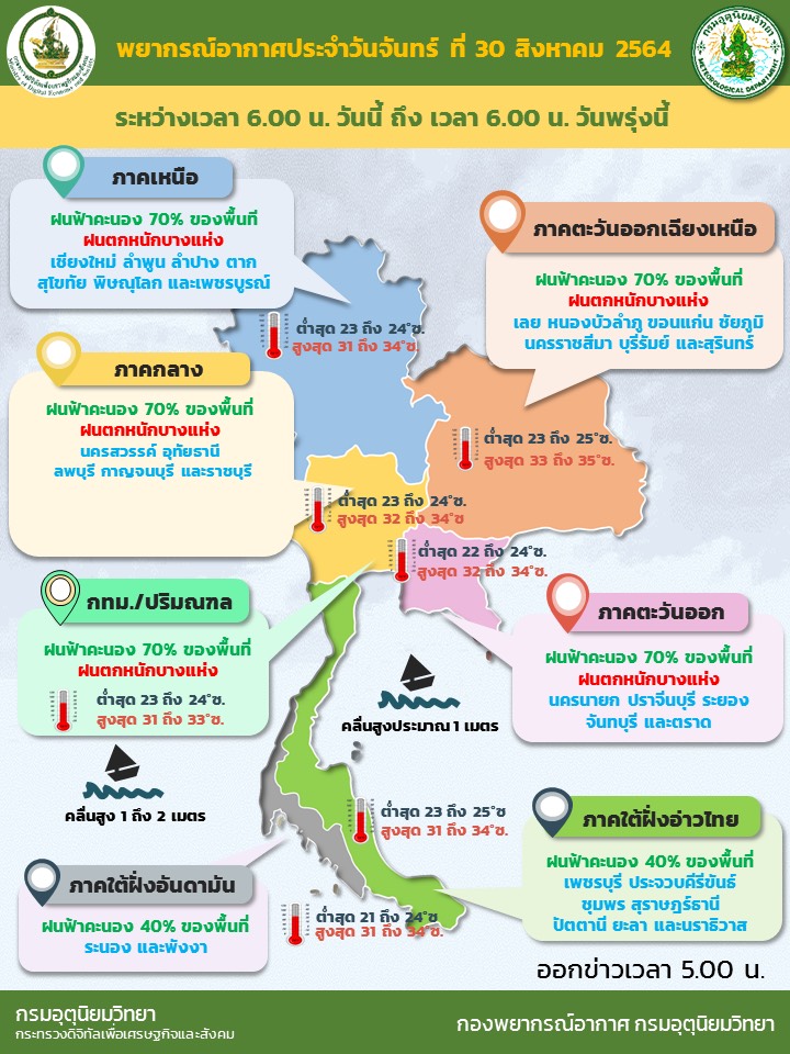 กทม. 30 ส.ค.-รองผู้ว่าฯ กทม. ลงพื้นที่เร่งติดตามปัญหาน้ำท่วมชุมชนริมคลองด้านกรุงเทพฯ ตะวันออก ขณะที่พยากรณ์อากาศวันนี้ฝนตกหนักร้อยละ 70 ของพื้นที่