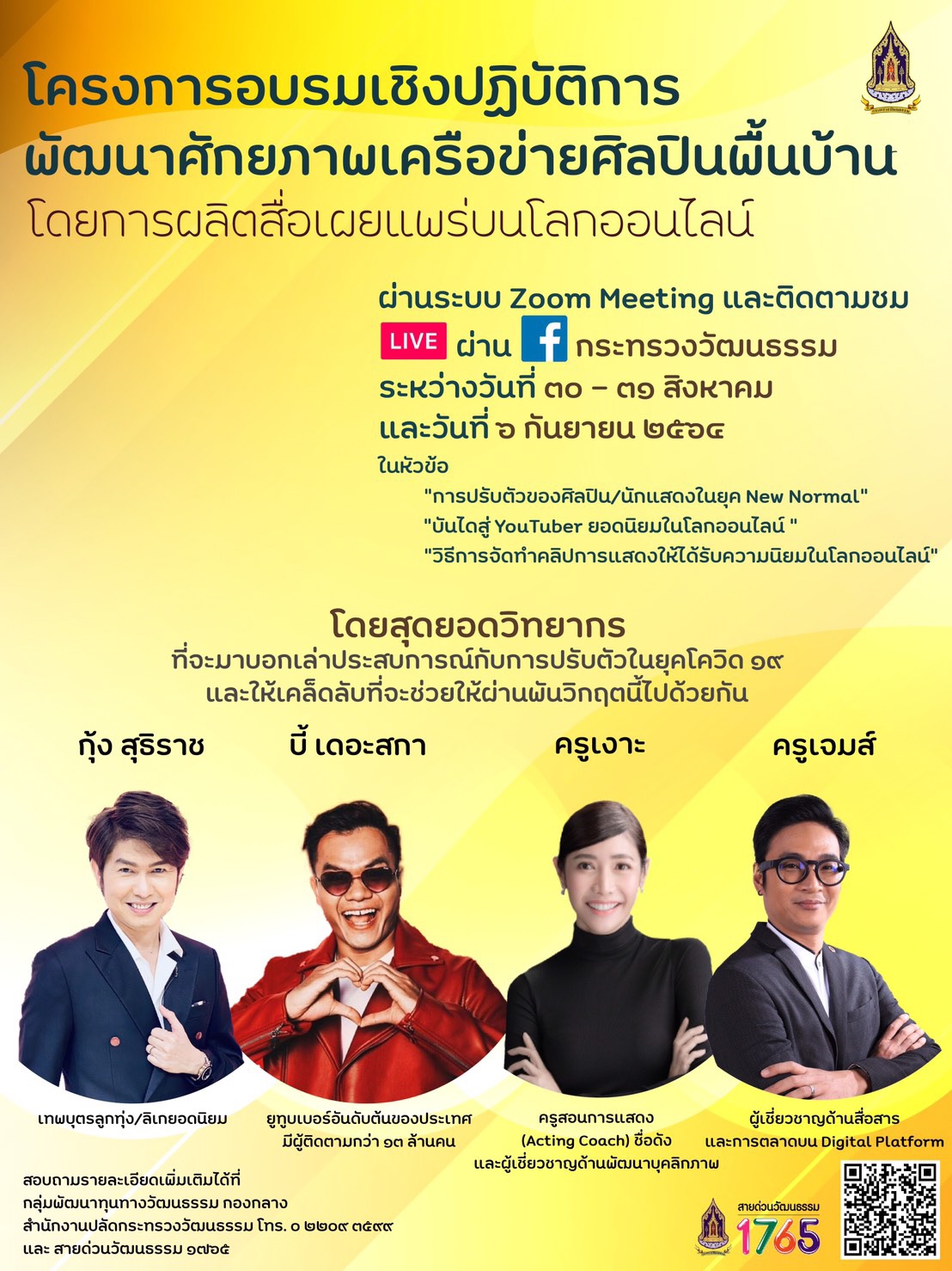วธ.จึงได้จัดอบรมเชิงปฏิบัติการพัฒนาศักยภาพเครือข่ายศิลปินพื้นบ้านโดยการผลิตสื่อเผยแพร่บนโลกออนไลน์ ขึ้นระหว่างวันที่ 30-31 สิงหาคม 2564 และวันที่ 6 กันยายน 2564 โดยเชิญวิทยากรชื่อดังมาถ่ายทอดความรู้ประสบการณ์และเคล็ดลับการปรับตัวของศิลปิน นักแสดง การผลิตผลงานให้ได้รับความนิยมบนโลกออนไลน์ในยุค New Normal อาทิ กุ้ง สุทธิราช เทพบุตรลูกทุ่งชื่อดัง, บี้ เดอะสกา Youtuber 500 ล้าน ที่มีผู้ติดตามกว่า 13 ล้านคน, ครูเงาะ Acting Coach อันดับต้นของประเทศและครูเจมส์ ผู้เชี่ยวชาญด้านสื่อสาร และการตลาดบน Digital Platform โดยจะมีการอบรมผ่าน Zoom และ Live สด ทาง Facebook กระทรวงวัฒนธรรม ให้ศิลปินพื้นบ้านจำนวน 9 สมาคม เครือข่ายศิลปิน นักวิชาการวัฒนธรรม 76 จังหวัดและผู้สนใจเข้ารับชม