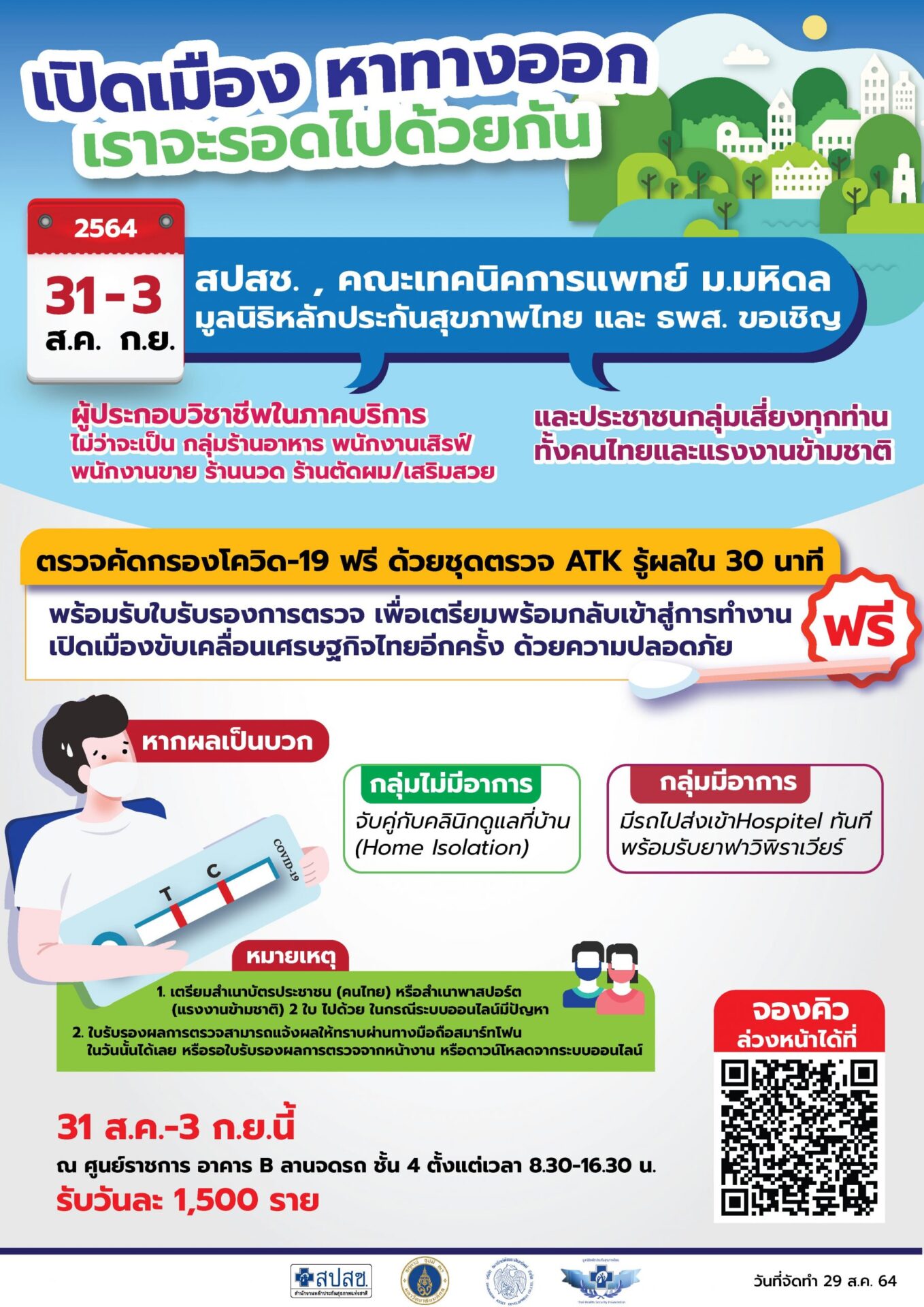 ทพ.อรรถพร ลิ้มปัญญาเลิศ รองเลขาธิการสำนักงานหลักประกันสุขภาพแห่งชาติ (สปสช.) เปิดเผยว่า สปสช.เตรียมร่วมมือกับคณะเทคนิคการแพทย์ มหาวิทยาลัยมหิดล, บริษัท ธนารักษ์พัฒนาสินทรัพย์ จำกัด (ธพส.) และมูลนิธิหลักประกันสุขภาพไทย จัดโครงการตรวจคัดกรองโควิด-19 ด้วย Antigen Test Kit (ATK) ในวันที่ 31 ส.ค.-3 ก.ย.64 นี้ โดยขอเชิญกลุ่มผู้ประกอบวิชาชีพในภาคบริการ ไม่ว่าจะเป็นกลุ่มร้านอาหาร พนักงานเสิรฟ์ พนักงานขาย ร้านนวด ร้านตัดผม/เสริมสวย และประชาชนกลุ่มเสี่ยงทั้งคนไทยและแรงงานข้ามชาติ มารับการตรวจได้ที่ลานจอดรถชั้น 4 อาคารบี ศูนย์ราชการเฉลิมพระเกียรติฯ ถ.แจ้งวัฒนะ ตั้งแต่เวลา 08.30-16.30 น. เบื้องต้นตั้งเป้าว่าจะตรวจให้ได้ประมาณวันละ 1,500 ราย