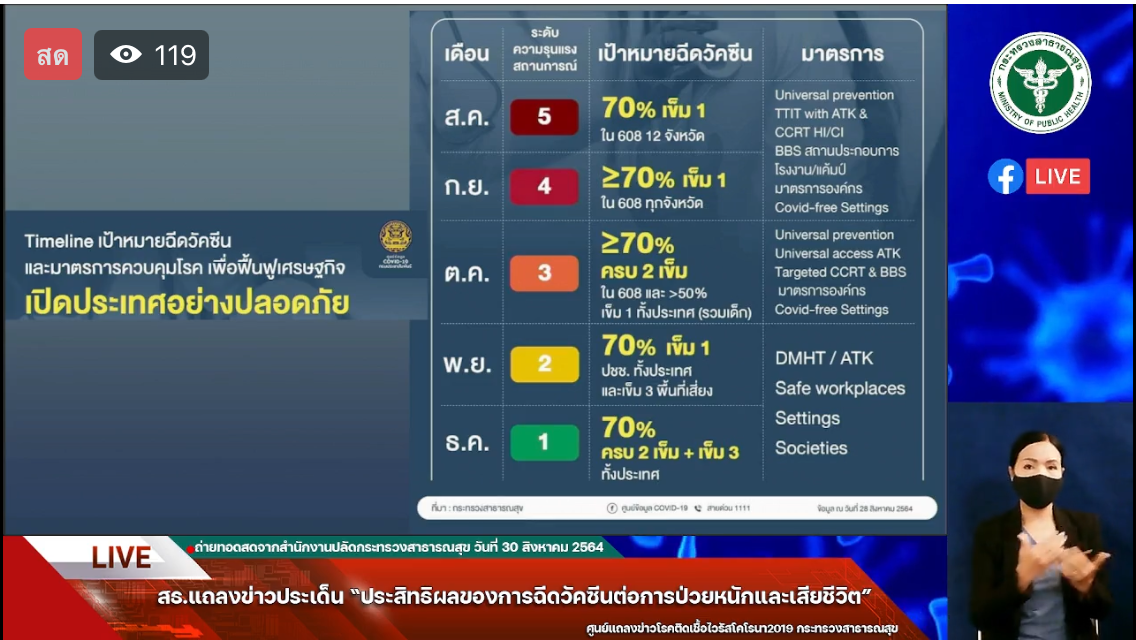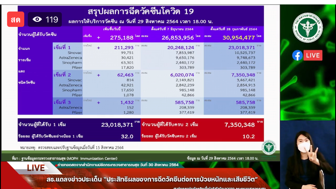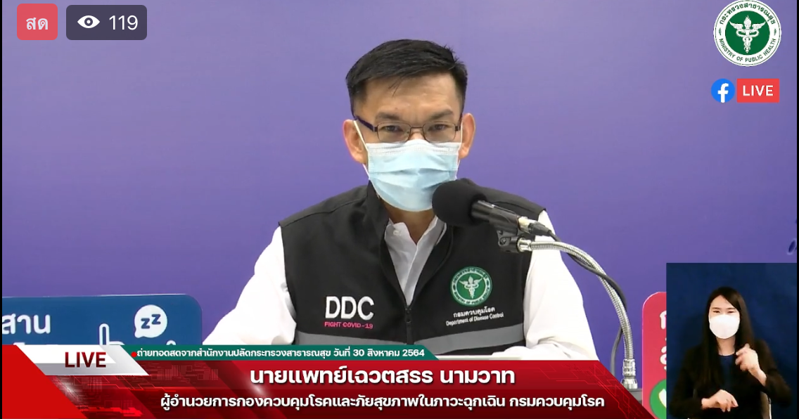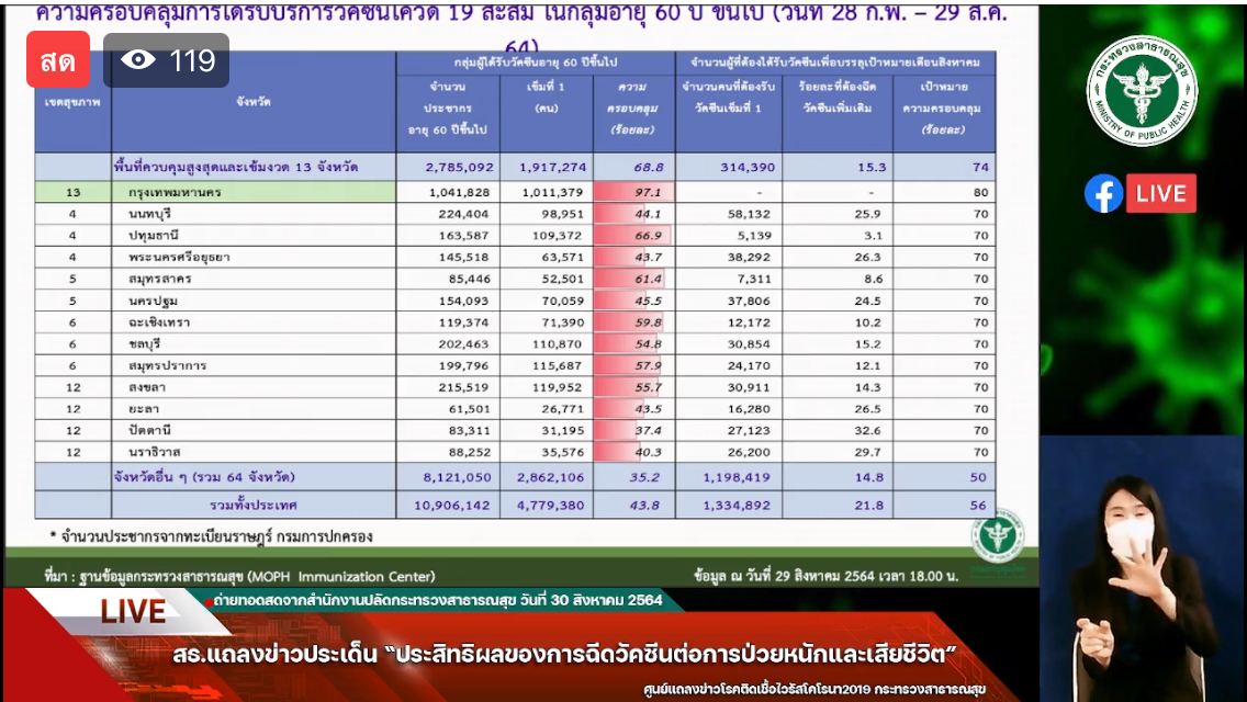 นพ.เฉวตสรร นามวาท ผู้อำนวยการกองควบคุมโรคและภัยสุขภาพในภาวะฉุกเฉิน กรมควบคุมโรค กระทรวงสาธารณสุข แถลงว่าขณะนี้มียอดผู้ฉีดวัคซีน ทั้งหมดกว่า30.9 ล้านโดสแล้ว ส่วนใน 13 จังหวัดพื้นที่ควบคุมสูงสุดและเข้มงวดโดยเฉพาะในกรุงเทพฯ มีการฉีดวัคซีนครอบคลุม 97.1% ในผู้สูงอายุ ส่วนใน 64 จังหวัดมีฉีดในผู้สูงอายุ 35.2% แล้ว ในภาพรวมฉีดผู้สูงอายุ ไปแล้ว43.8% ทั้งประเทศ ซึ่งเป็นแนวทางมาตรฐานในการลดการป่วยหนักและเสียชีวิต ส่วนบุคลากรทางการแพทย์ฉีดได้2เข็มถึงร้อยละ 108.1%