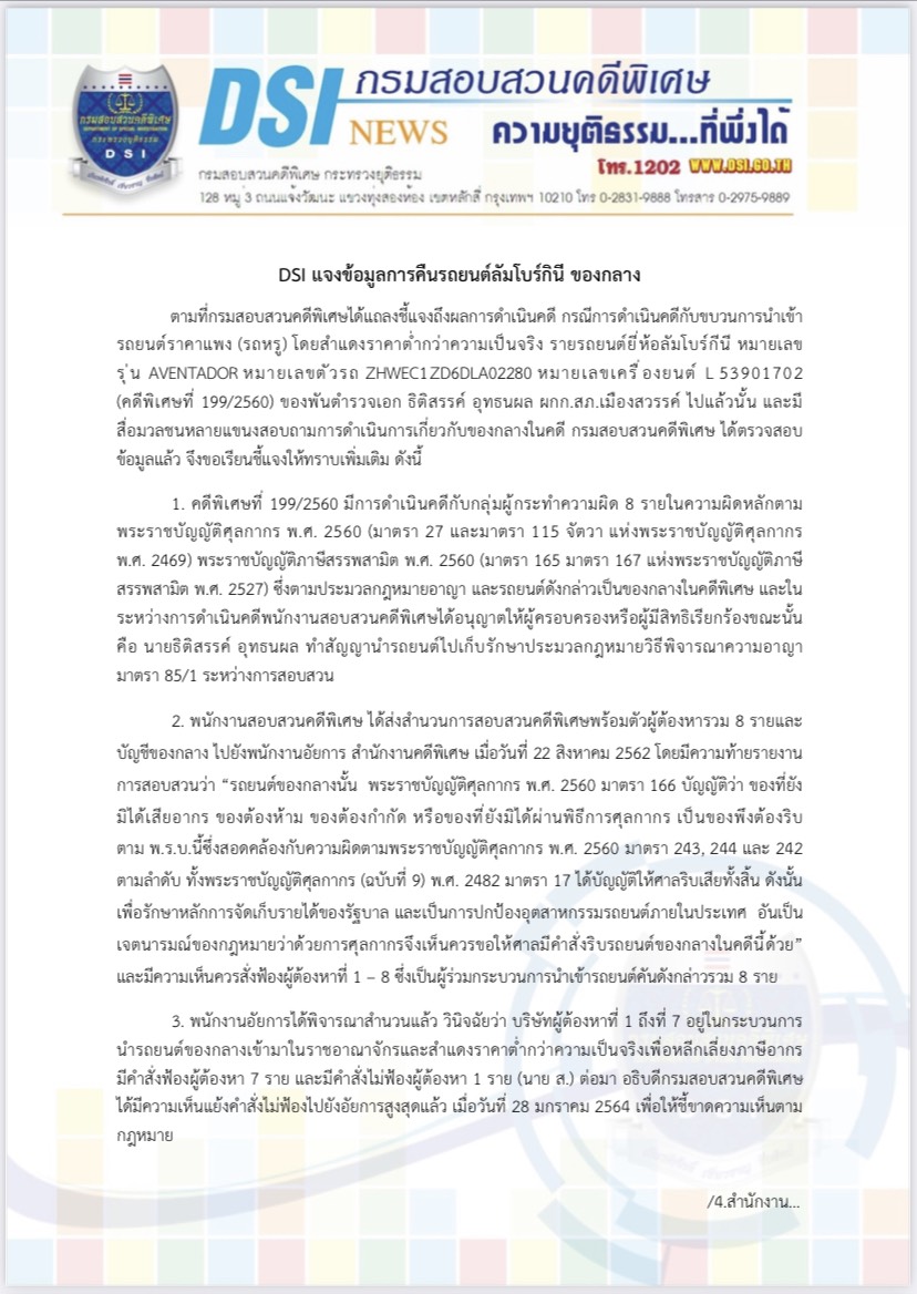กรมสอบสวนคดีพิเศษ ออกแถลงการณ์แจงข้อมูลการคืนรถยนต์ลัมโบร์กินีของกลาง ตามที่กรมสอบสวนคดีพิเศษได้แถลงชี้แจงถึงผลการดำเนินคดี กรณีการดำเนินคดีกับขบวนการนำเข้ารถยนต์ราคาแพง (รถหรู) โดยสำแดงราคาต่ำกว่าความเป็นจริง รายรถยนต์ยี่ห้อลัมโบร์กีนี หมายเลขรุ่น AVENTADOR หมายเลขตัวรถ ZHWEC1ZD6DLA02280 หมายเลขเครื่องยนต์ L53901702 (คดีพิเศษที่ 199/2560) ของ พ.ต.อ.ธิติสรรค์ อุทธนผล ผกก.สภ.เมืองสวรรค์ ไปแล้วนั้น และมีการสอบถามถึงการดำเนินการเกี่ยวกับของกลางในคดี กรมสอบสวนคดีพิเศษ ได้ตรวจสอบข้อมูลแล้ว จึงขอเรียนชี้แจงให้ทราบเพิ่มเติม ดังนี้