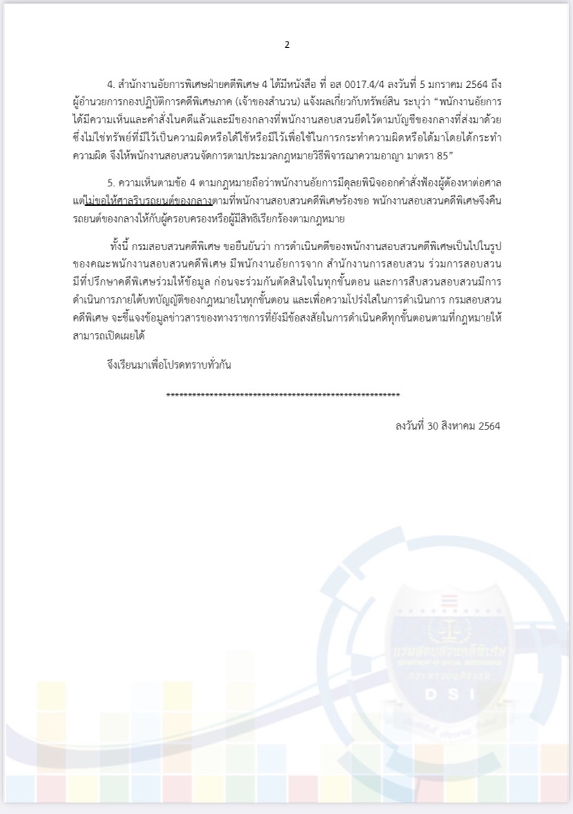 - สำนักงานอัยการพิเศษฝ่ายคดีพิเศษ 4 ได้มีหนังสือ ที่ อส 0017.4/4 ลงวันที่ 5 มกราคม 2564 ถึงผู้อำนวยการกองปฏิบัติการคดีพิเศษภาค (เจ้าของสำนวน) แจ้งผลเกี่ยวกับทรัพย์สิน ระบุว่า “พนักงานอัยการได้มีความเห็นและคำสั่งในคดีแล้ว และมีของกลางที่พนักงานสอบสวนยึดไว้ตามบัญชีของกลางที่ส่งมาด้วย ซึ่งไม่ใช่ทรัพย์ที่มีไว้เป็นความผิดหรือได้ใช้หรือมีไว้เพื่อใช้ในการกระทำความผิดหรือได้มาโดยได้กระทำความผิด จึงให้พนักงานสอบสวนจัดการตามประมวลกฎหมายวิธีพิจารณาความอาญา มาตรา 85”